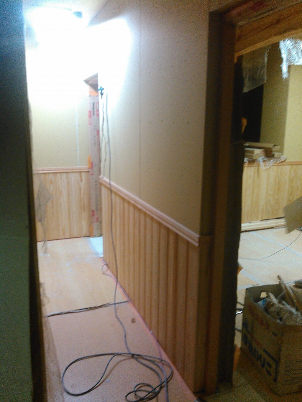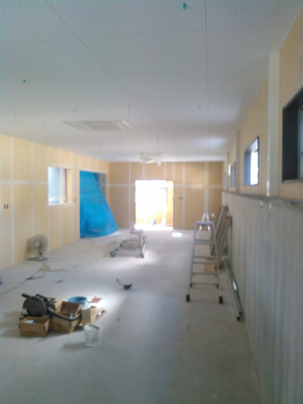 この建築業界、あまり休日は関係なく、現場ではクロスを張る職人さんも、ボードの継ぎ目となる個所へパテを行ってくれていました。下地のよし悪しで、仕上げの出来も大きく変わる事から、丁寧な作業行ってくれています。