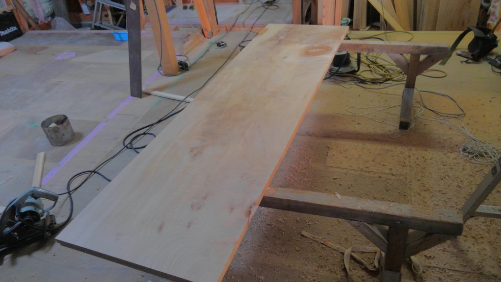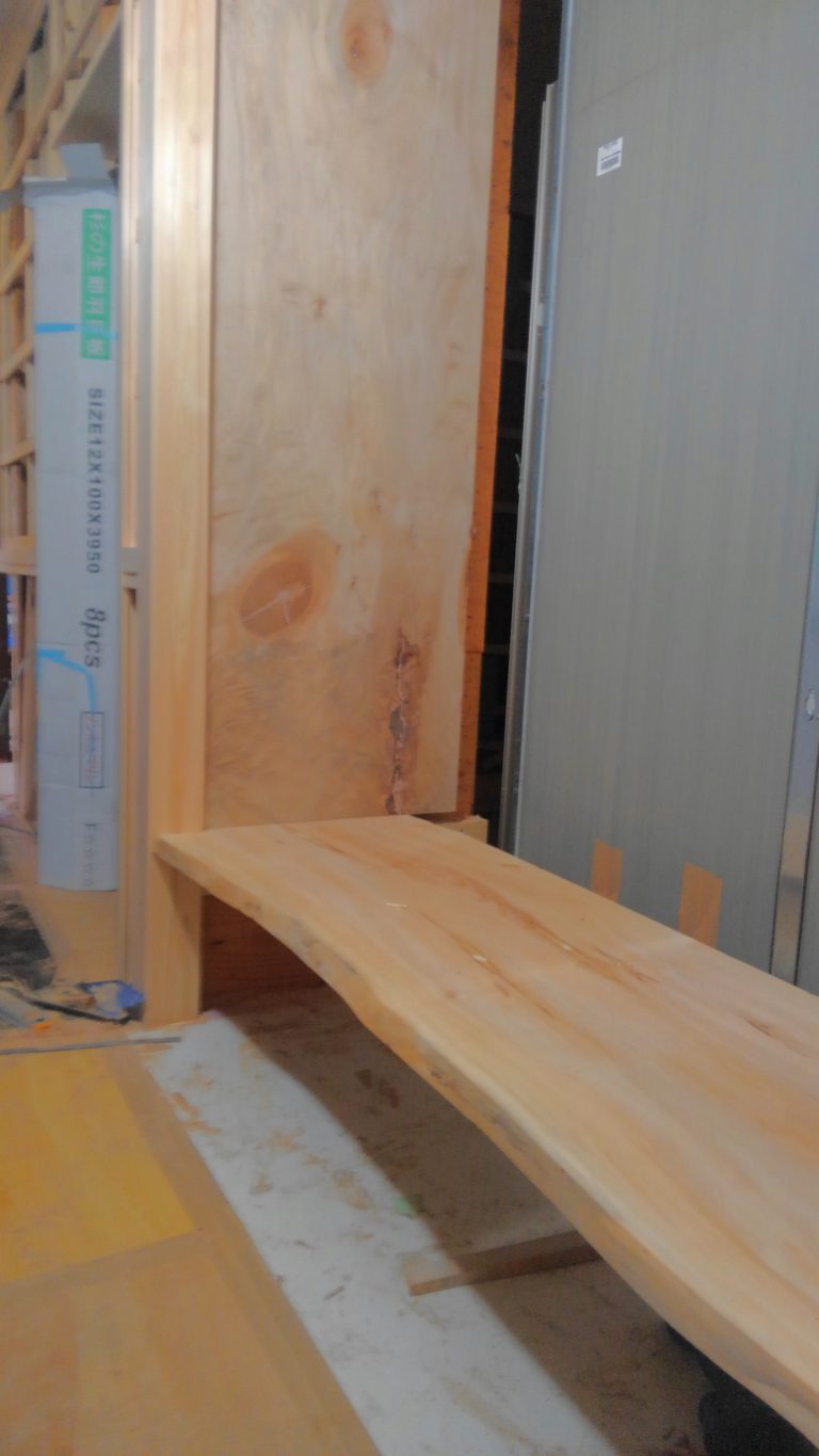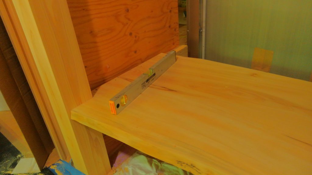 まずは、あらかじめ加工を行った「トチの木」の無垢の天板をバシッと取り付け、ここら辺までは簡単な作業ですが、