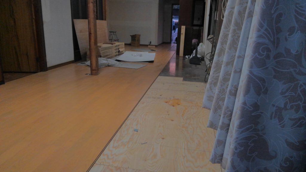 本日の仕事はLDKのフワフワしょった床を、二重張りして頑丈にする作業と、一部建具枠を取り付ける作業を頼まれとんですが、普段の仕事とは違い、人の仕事のお手伝いという事で、気が楽ちゃあ気が楽!!!。
