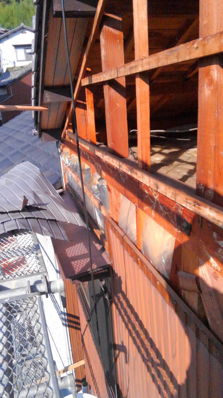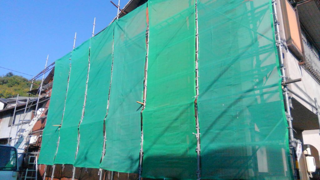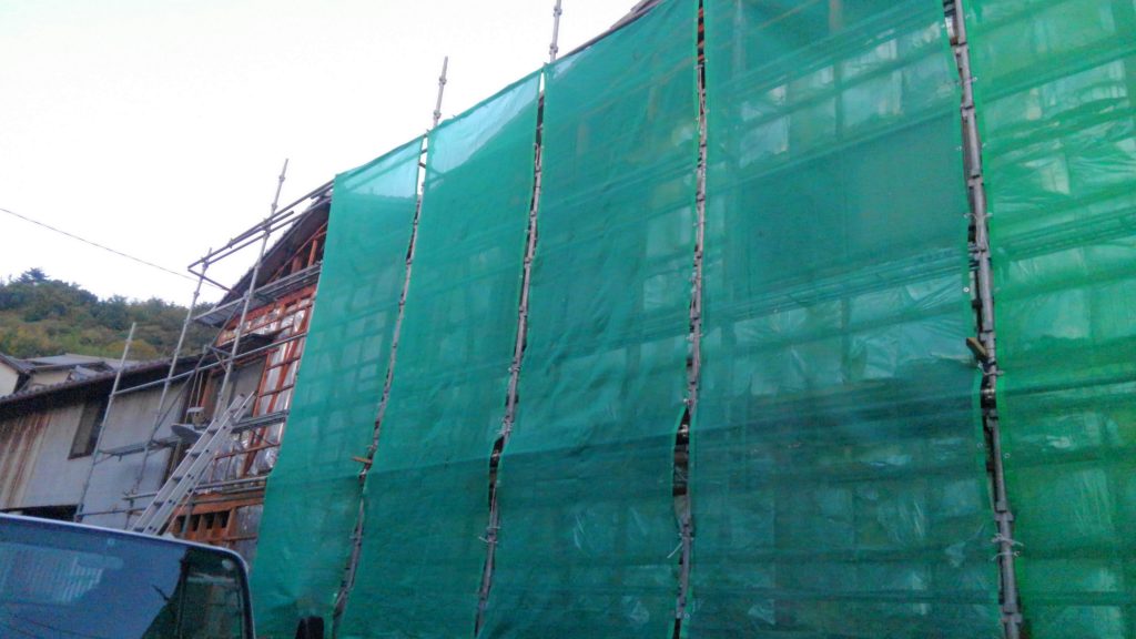 その後、足場をばらしたついでに、いやいや・・・ついでと言っては悪いんですが・・・お世話になっとるS様の紹介で、下津井のY様邸の外壁修繕作業へ急遽お邪魔させてもらいました。