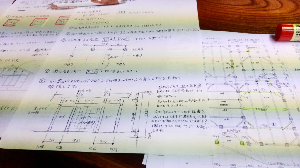 図面とのにらめっこ・・・見えない建物を想像しながら、完成後の形にワクワクしながら、棟梁という者だけが楽しめる作業。今晩は一人修正作業事務所でガンバリマス。