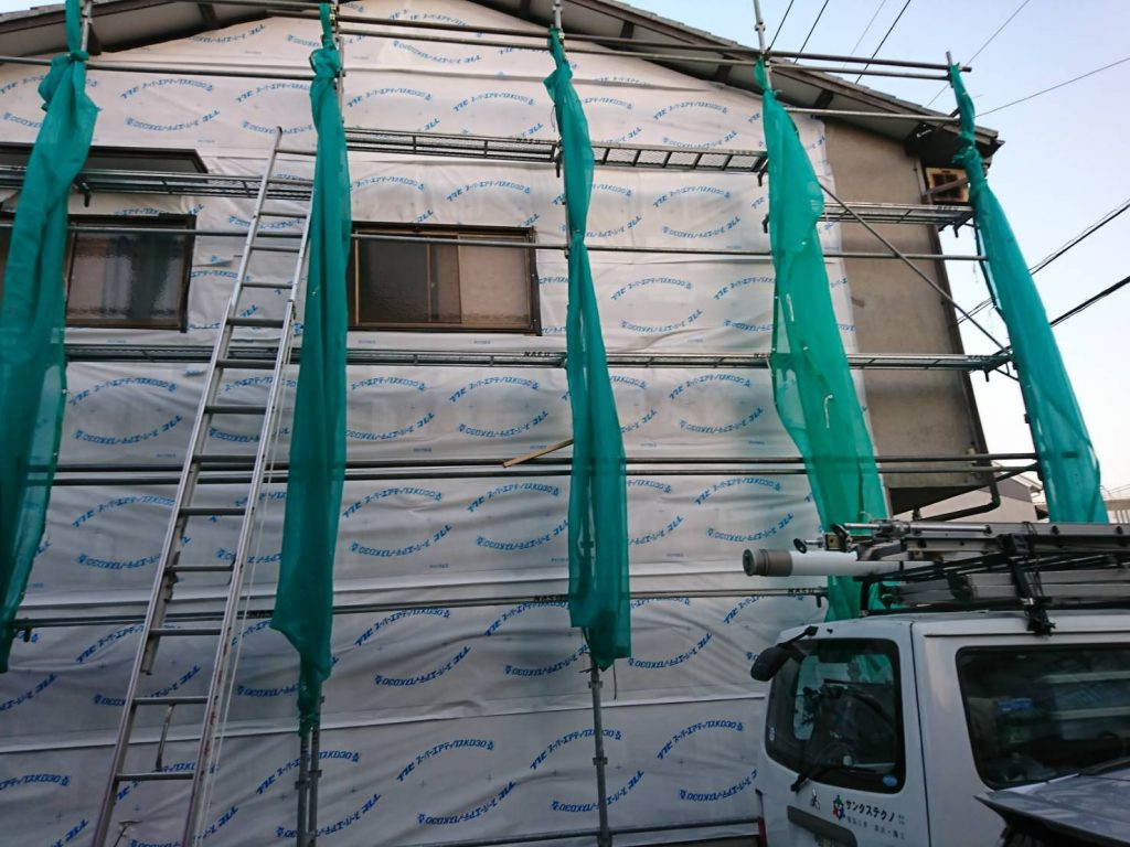 そんな本日は、「軒天」という、屋根裏側というか、なんと言えばえんじゃろ???まぁそんなところに、燃えん板をペタペタ重ね張りを行なったり、外壁下地の腐った木材を取り外し、新しい桟を打ち換えたり、外壁回りにシートを張ったり・・・などなど、明日からの焼き板作業の準備を行いました。