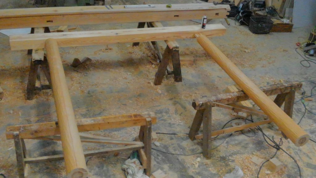 次の作業は、ポーチに取りつくく屋根の骨組み作り。