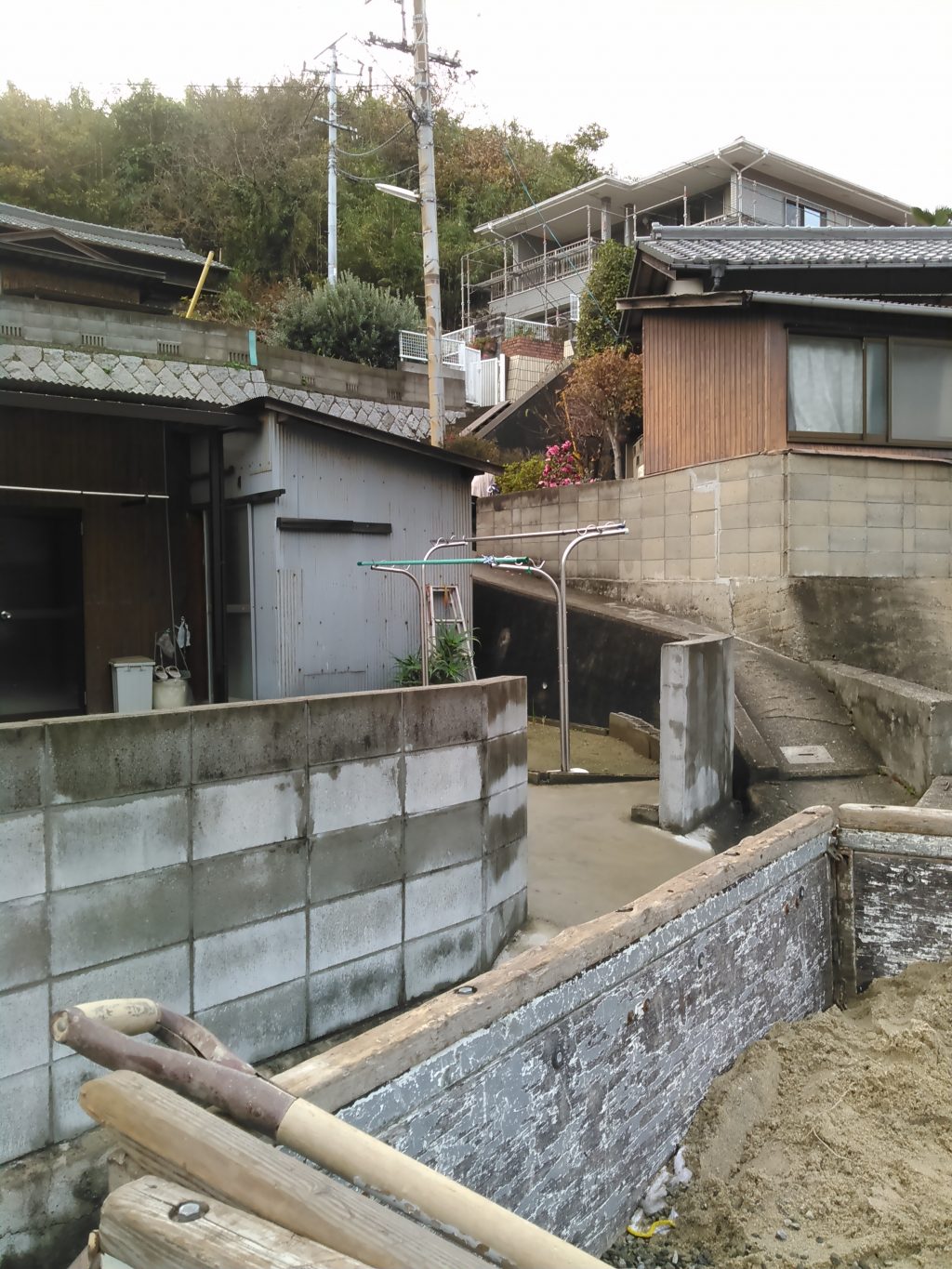その後、下津井へ戻り、昨日の続きでK様邸の何でも屋さん(左官、基礎、大工)、やってきました。