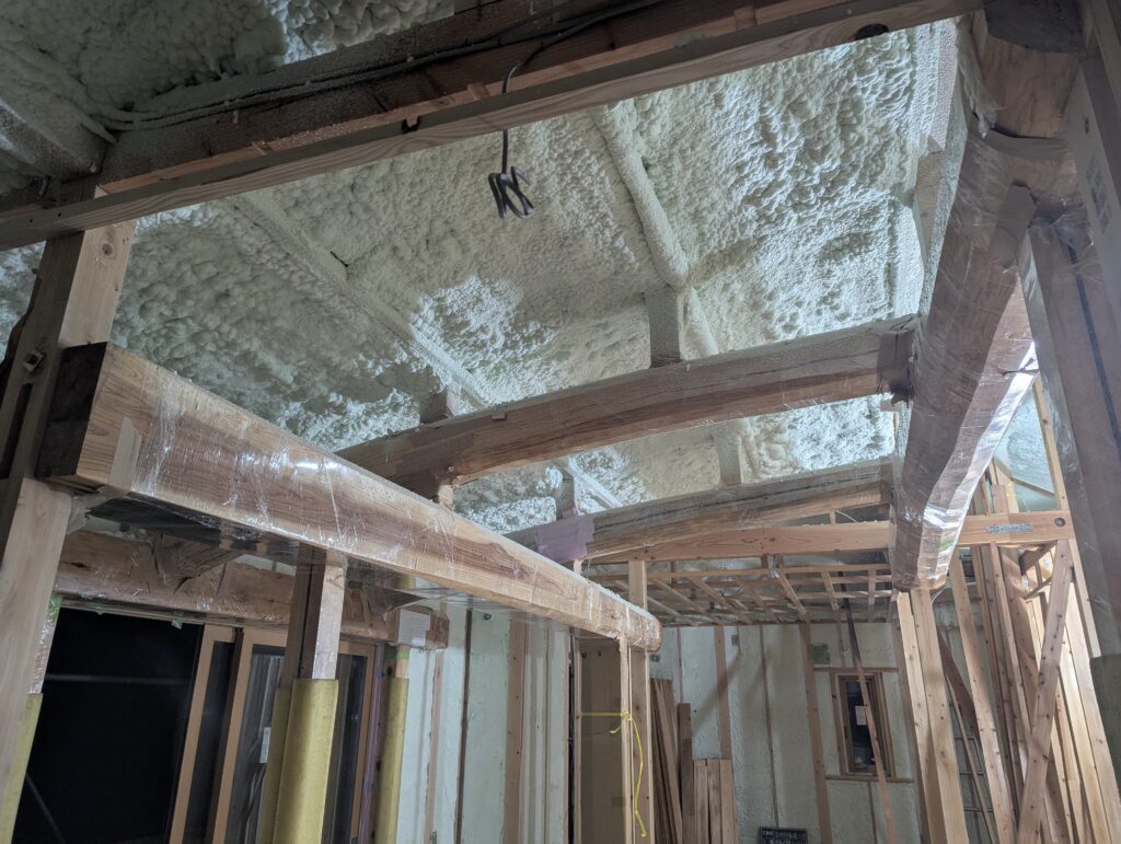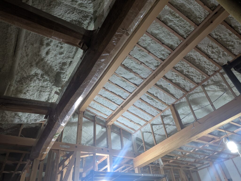 屋根の断熱材を、指定寸法をはるかに超えて吹き付けとる。