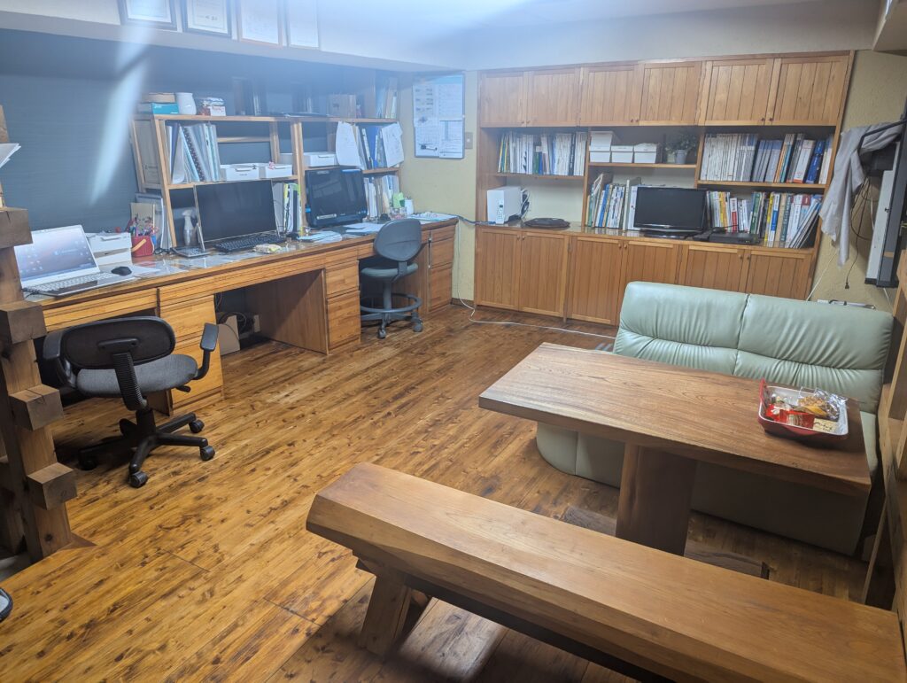いつも机の上はワヤくその那須建築の事務所ですが、今日は誰か来たんか???きれいに掃除もされて片付いとる。