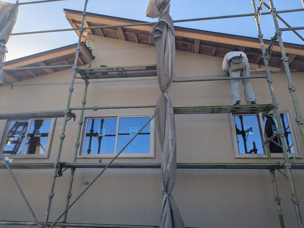我々のような小さな工務店はやれることは自分でなんでもやらんとおえんけん、外壁工事頑張って進行中です。