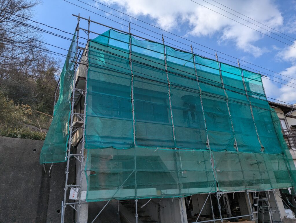 外壁も張り終え、今日から防水工事屋さんにも入ってもらいコツコツ・・・作業は進行です。