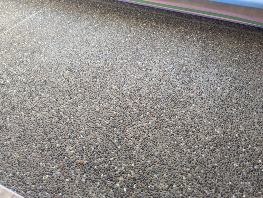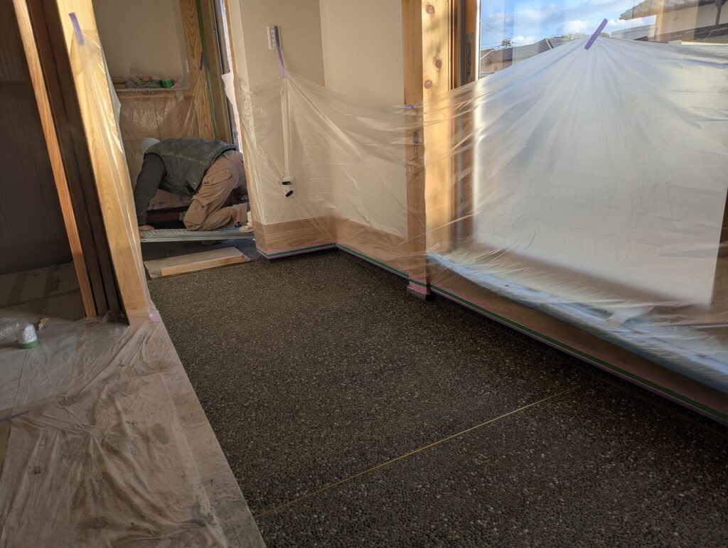 その他、児島のI様邸では左官屋さんが入ってくれていて、土間部分の通称「洗い出し」の作業が行われております。