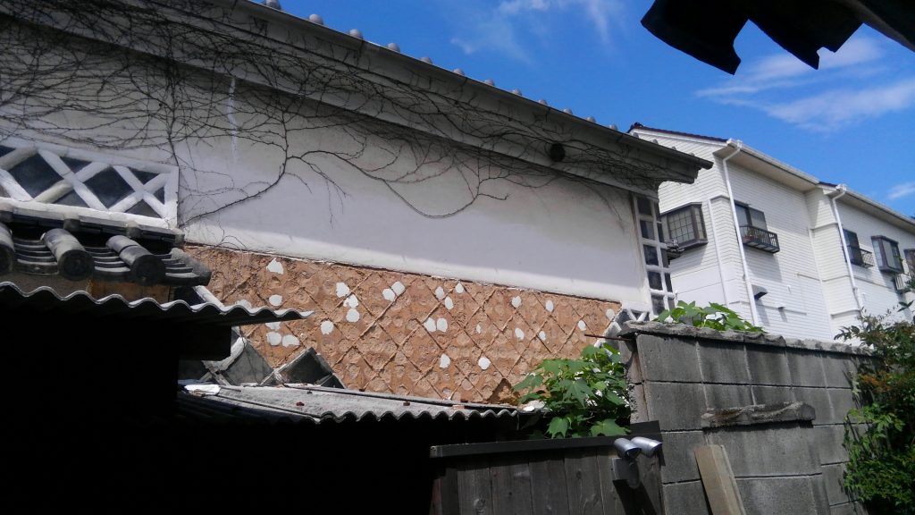 立派な蔵ですが、壁に張っとるなまこ壁の、一部が時間の経過もあり「ボロッと・・・」落ちてしまい、その修繕。