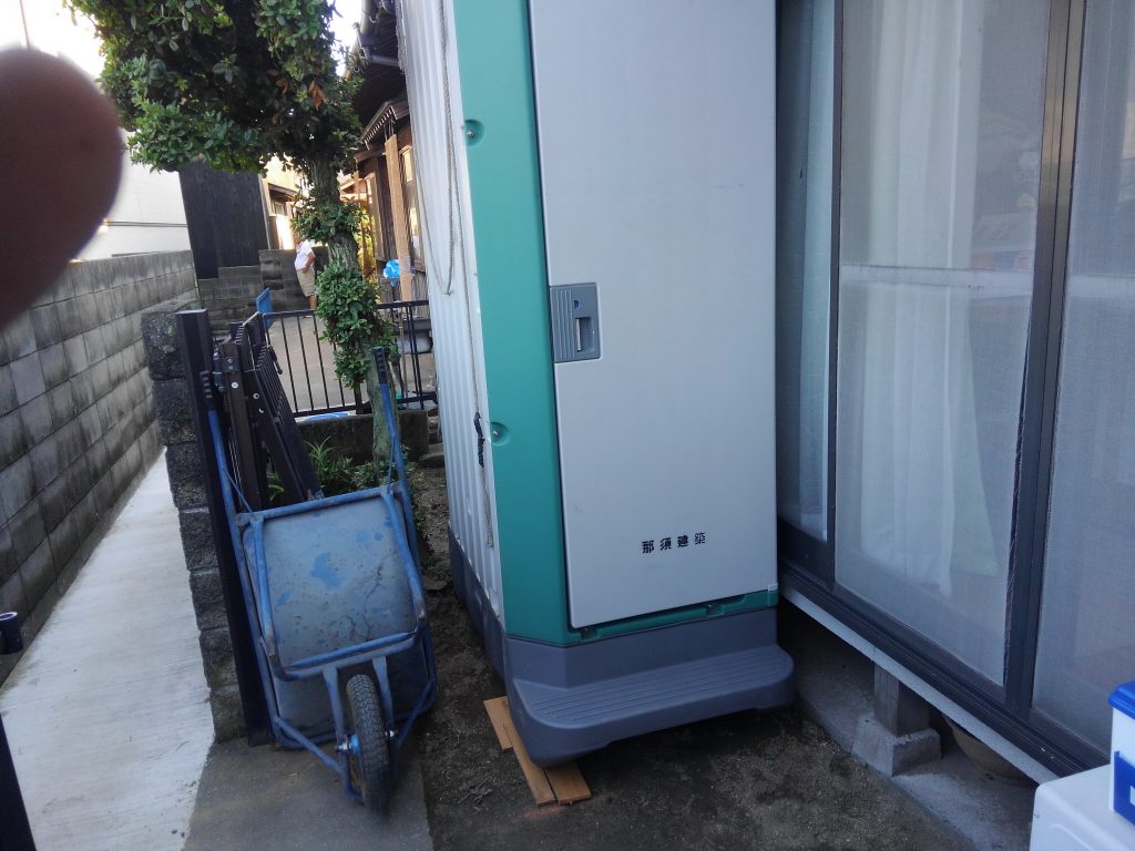 まずは一発目は、近所の某施設新築工事で使っておいた仮設便所を、汲み取りも行ってもらい、そのまま現場へと引っ越し。今回はトイレの改修もあるため、いちおう現場にセット。