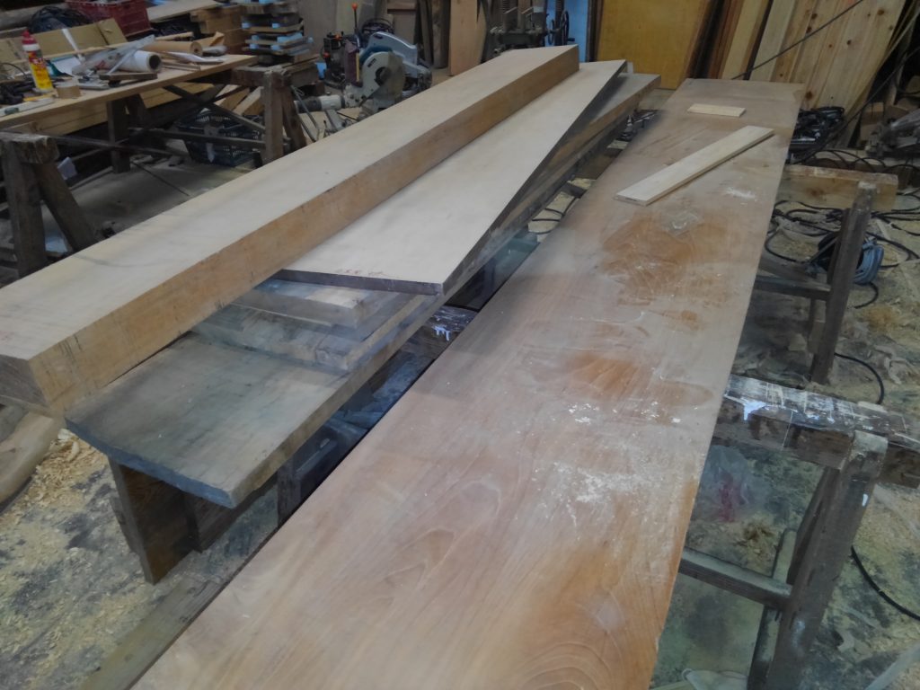 切り間違いでもした時には、ワシの日当では、一週間ぐらい「ただ働き???」になりそうな材料で、親子喧嘩しょぉる暇もなく、木材との真剣作業。