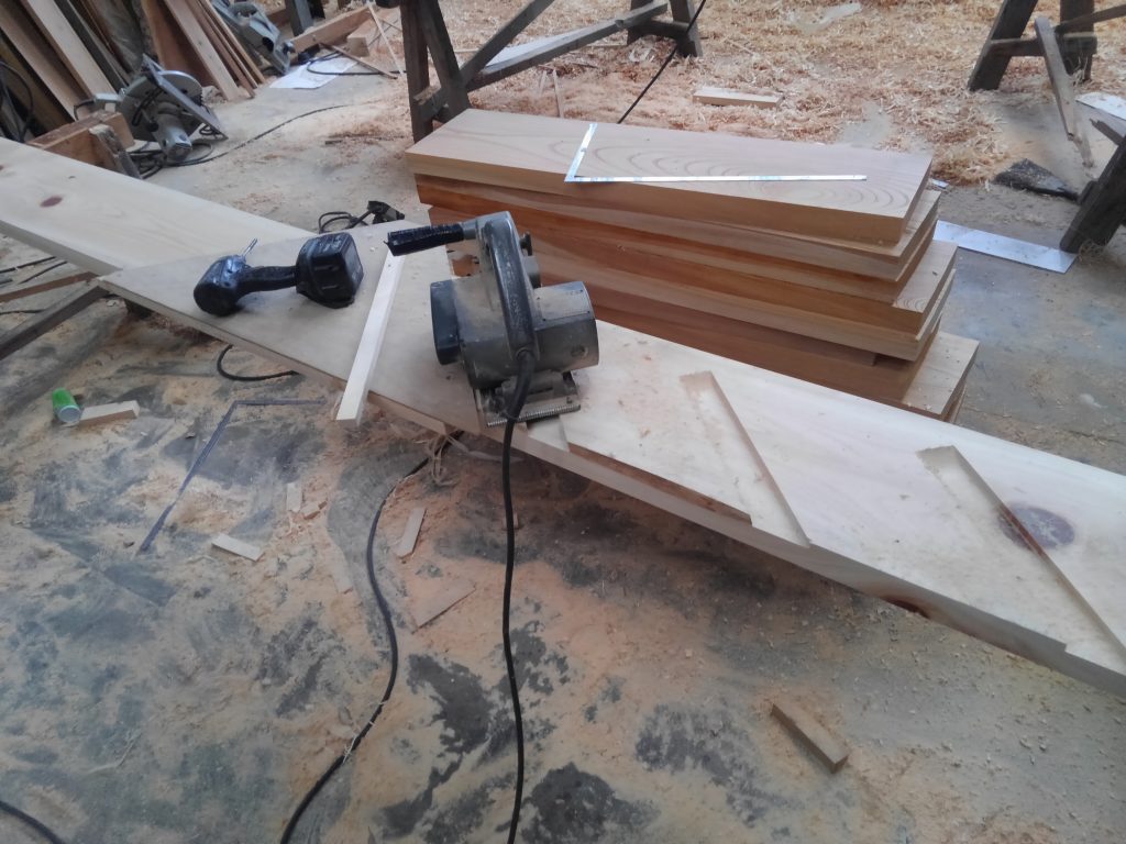 その後、いろいろ作業を行ってきましたが・・・そろそろ材料が無い!!!という事に気づき、作業場での一個ずつ、削っては、取り付け、削っては、取り付け・・・の最近の住宅づくりの主流となる建材を、一切使わん、昔ながらの大工が作る家づくりの「削って作業」