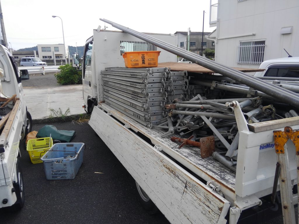 その後余った時間で、「トイがかかったでぇぇ!!!」と近所のN様邸でトイの掛替作業を行ってくれていた板金屋さんから連絡があり、天気も良かったんで、昼からは、社長とUさんの三人で、N様邸の足場バラシ作業へお邪魔しました。