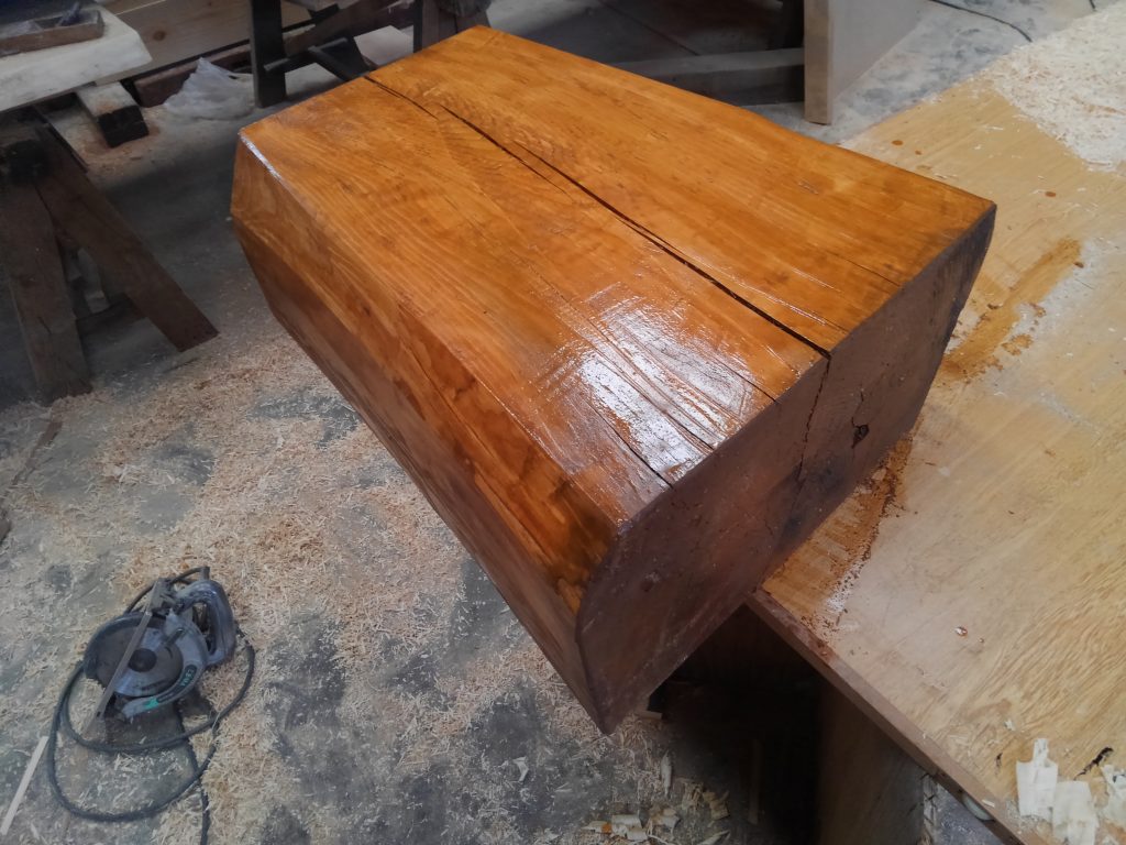 ウッドデッキの踏み台として、資材置き場の方から、数年前の建てさせてもらったS様邸のドガにも利用できん、梁丸太のきれっぱしを利用して、電気カンナでブぅぅ~ン・・と削り、防水塗料を塗り込み、少々お化粧。