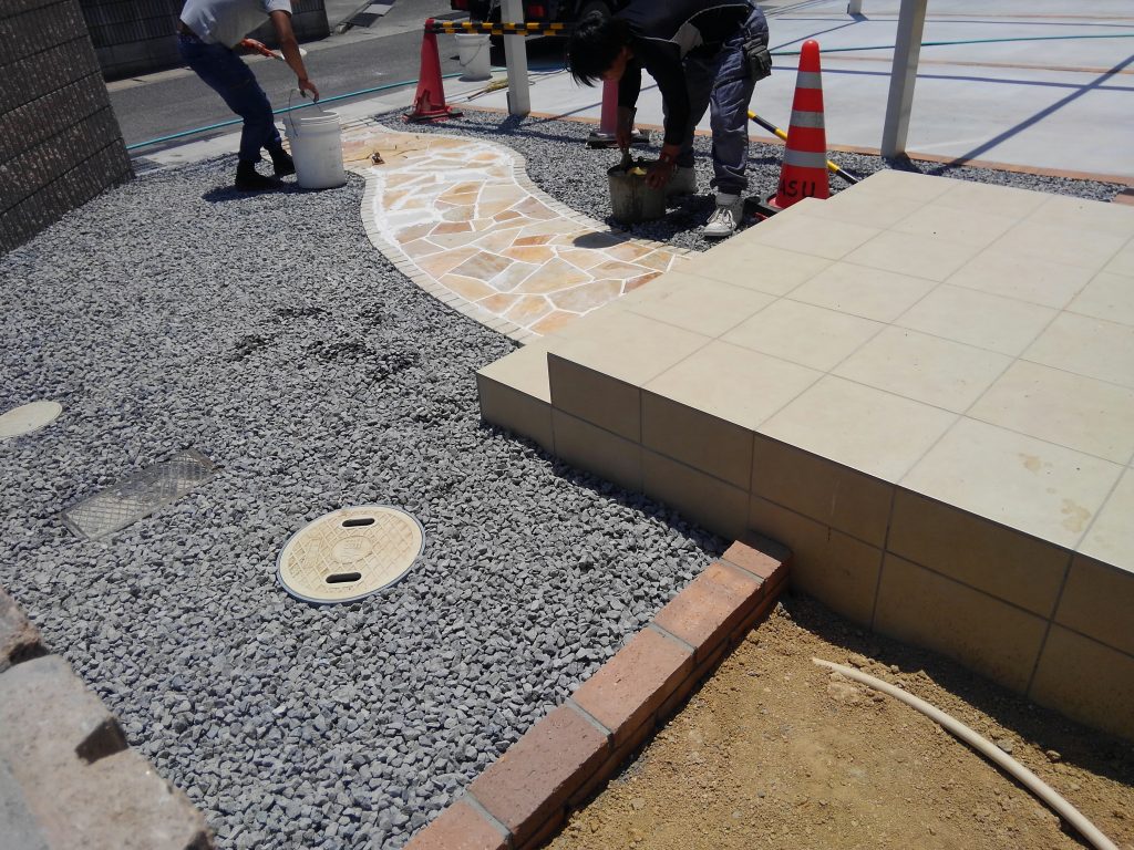 今回は天然の割石を、敷き詰め、センス良く張り込んでいく作業。