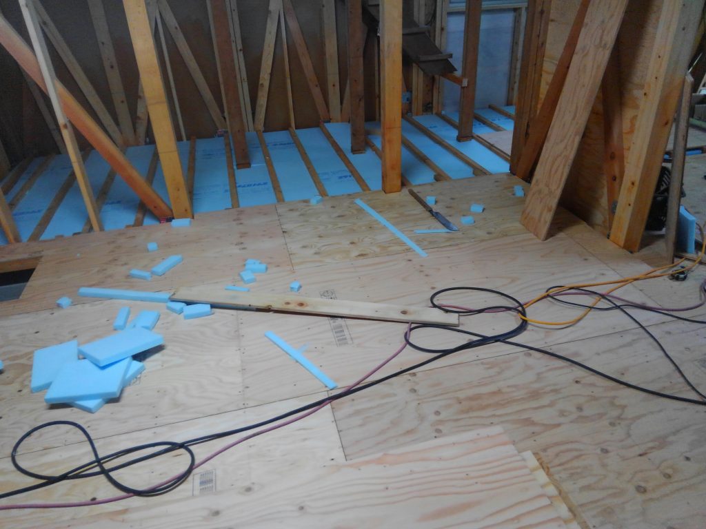 今日は一階の床を作るための下準備で、断熱材をはめつつ、その上にコンパネを張りつつ、たまに足を踏み外し断熱材を割りつつ、ほんならまたそれを修繕をしつつ、またコンパネを張っていく作業をガンバリマシタ。