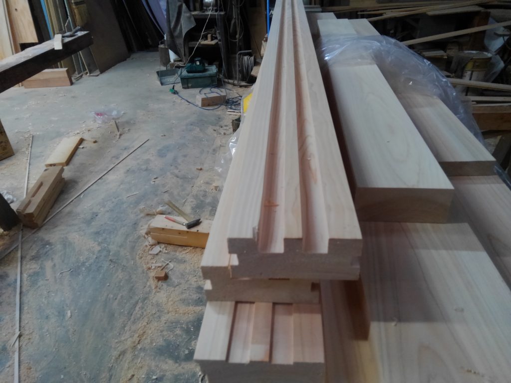 その後、昼前からは、下津井に戻り近所のK様邸再生工事の現場へ行こうか???行かまいか??悩んだんですが、「やっぱり雨じゃけん行かん!!!」で作業場で、枠材の加工を行いました。