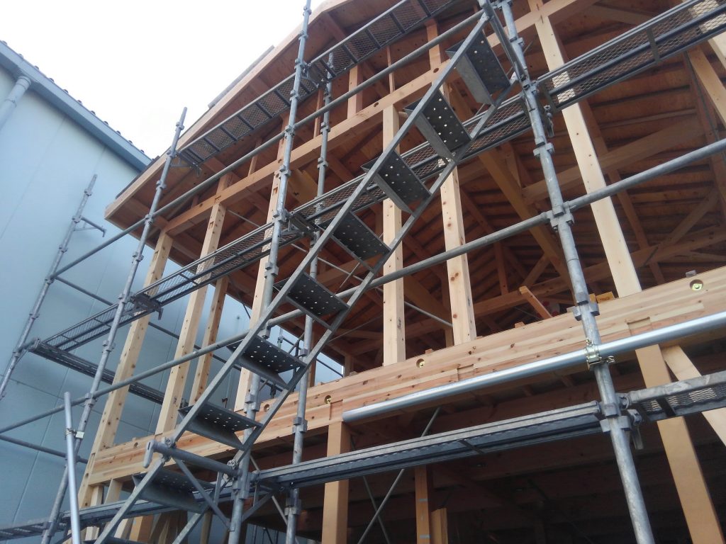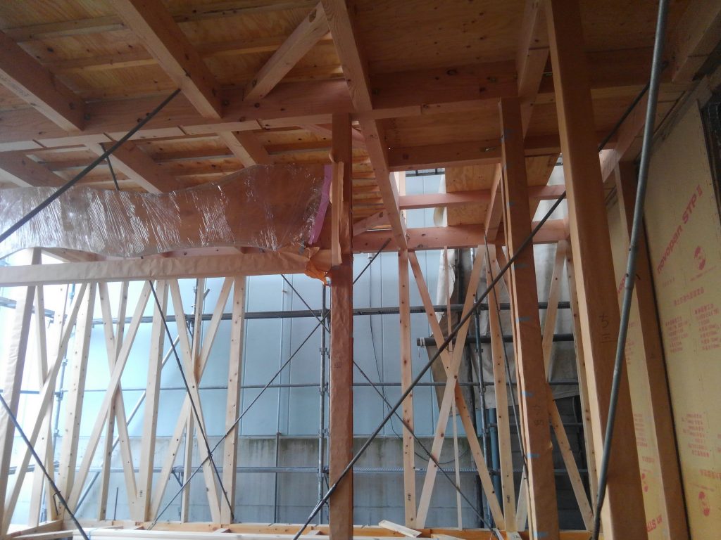 内部では、スジカイという地震やこぉに抵抗する、斜めのツッパリ材の取り付け、耐震用の金物の取り付け、外部に張る面材の取り付けなど、耐震対策を中心に行っていますが、余った時間で、サッシ周りの開口部の木下地の取り付けと、気候もよく気持ちよく作業は進行中です。