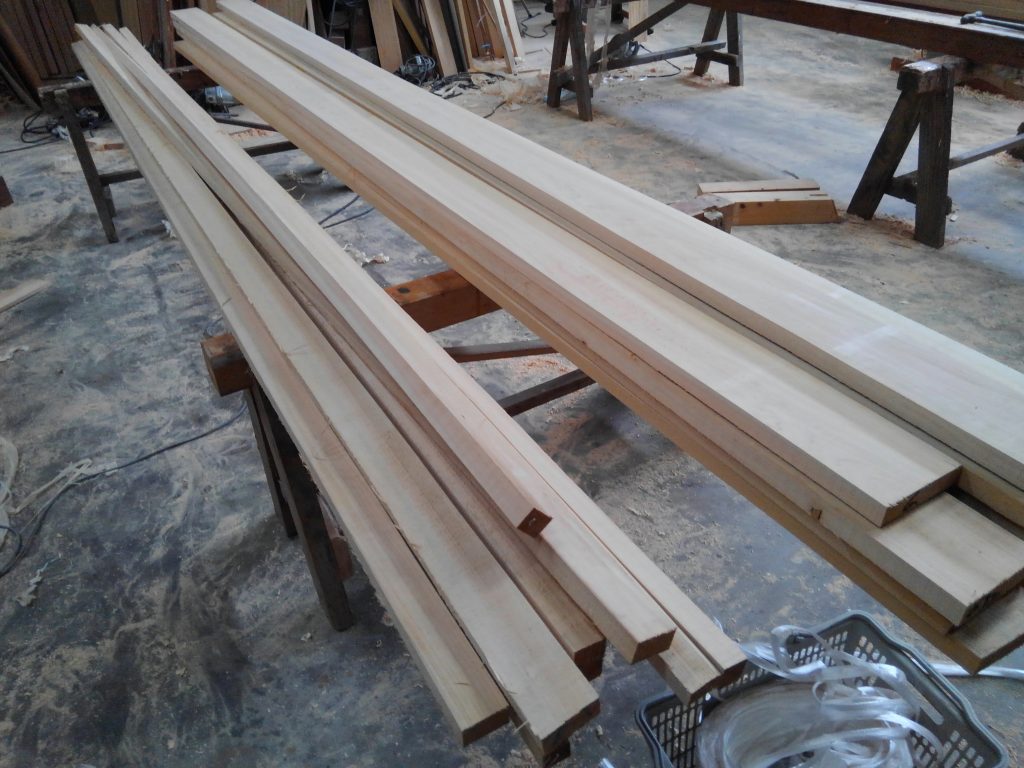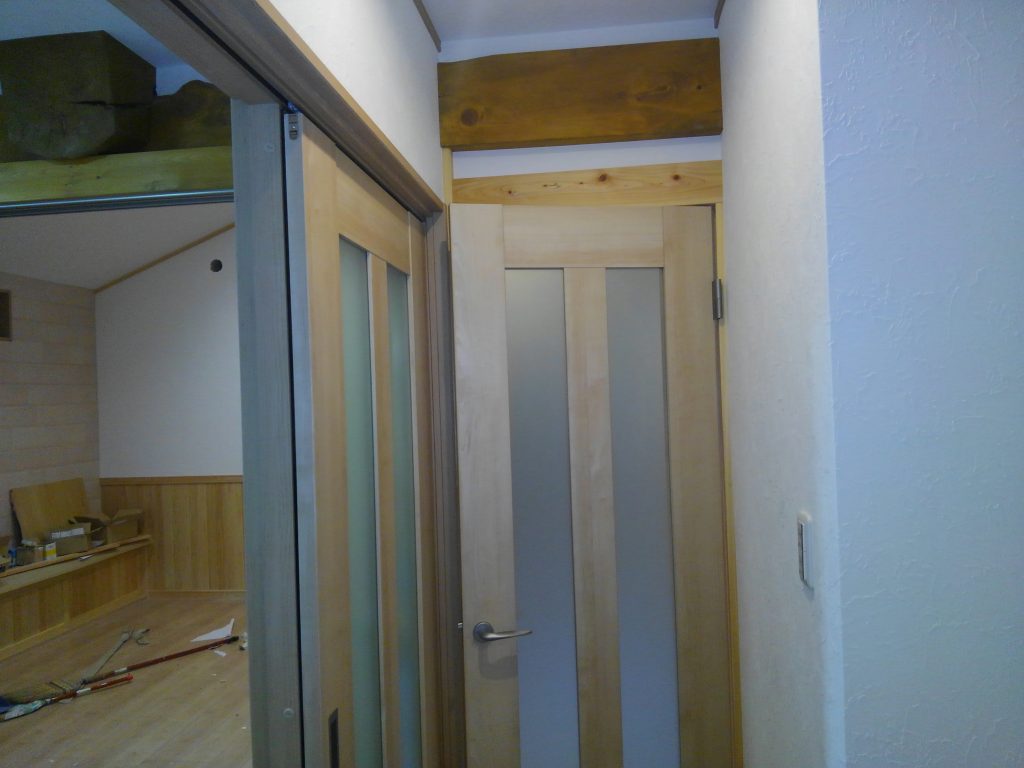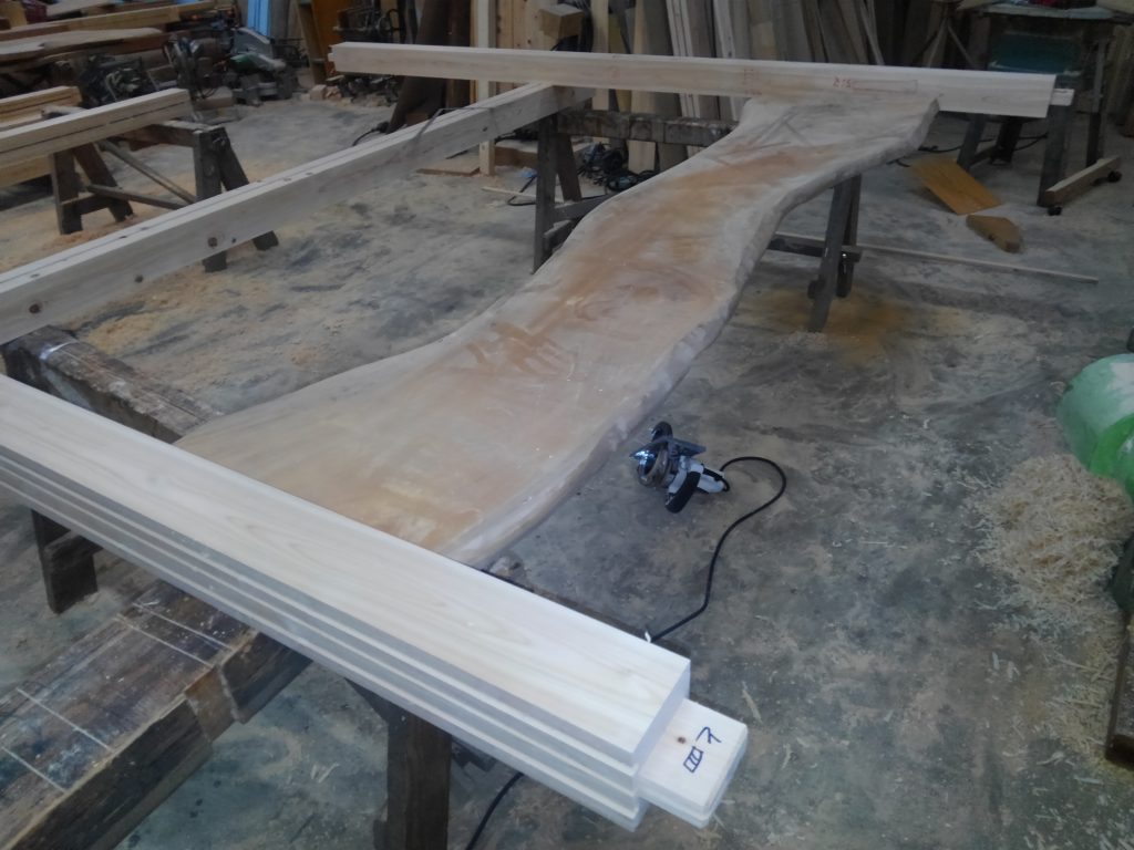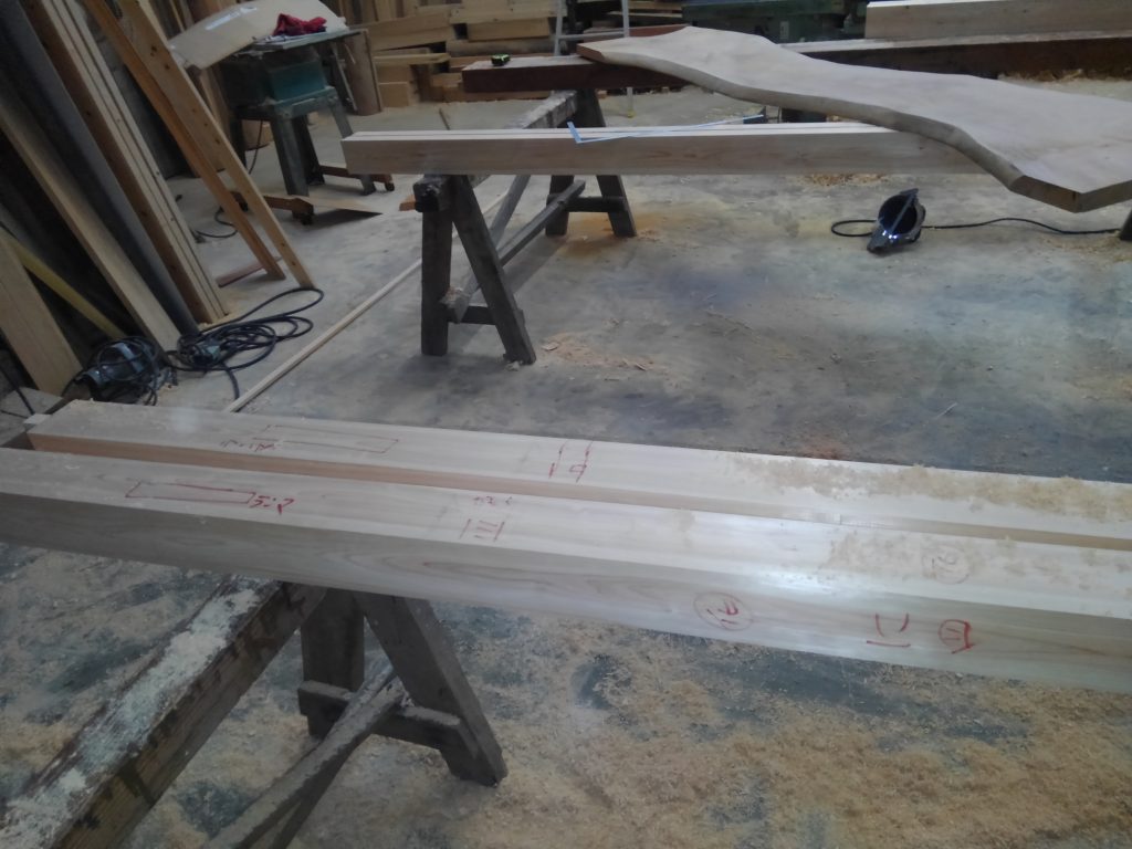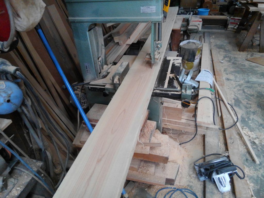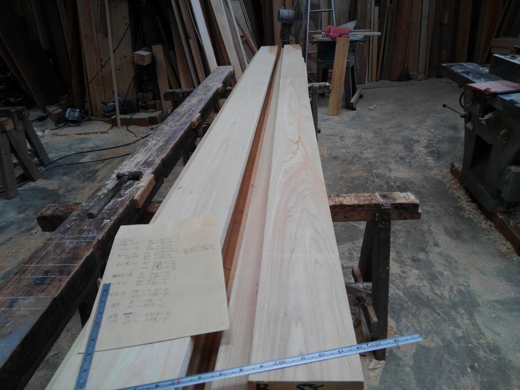 そんな本日は、近所のK様邸再生工事の上棟日でしたが、雨のための順延となり、作業場で内部の枠材の加工を中心に行いました。