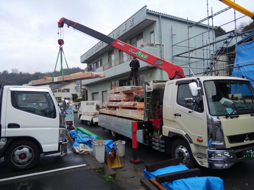そして、我々男子チームは、本日は近所のK様邸再生工事で、増築部の骨組みの荷受け作業からでした。