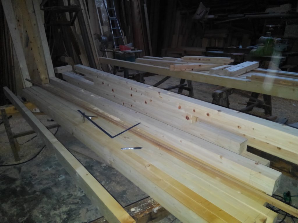 一方作業場でも、幅広の腰板のヒネリ取りやら、框材のカンナ掛けなど、一枚づつ丁寧に作業を進行。