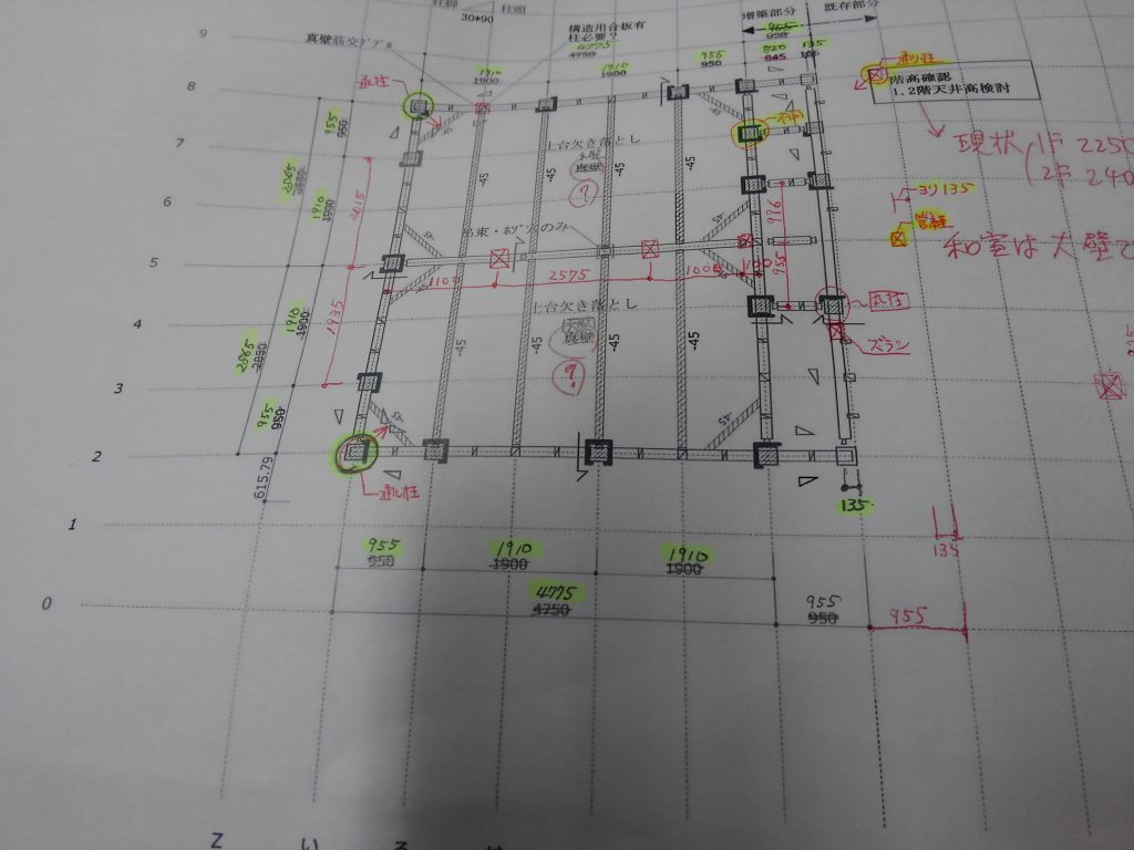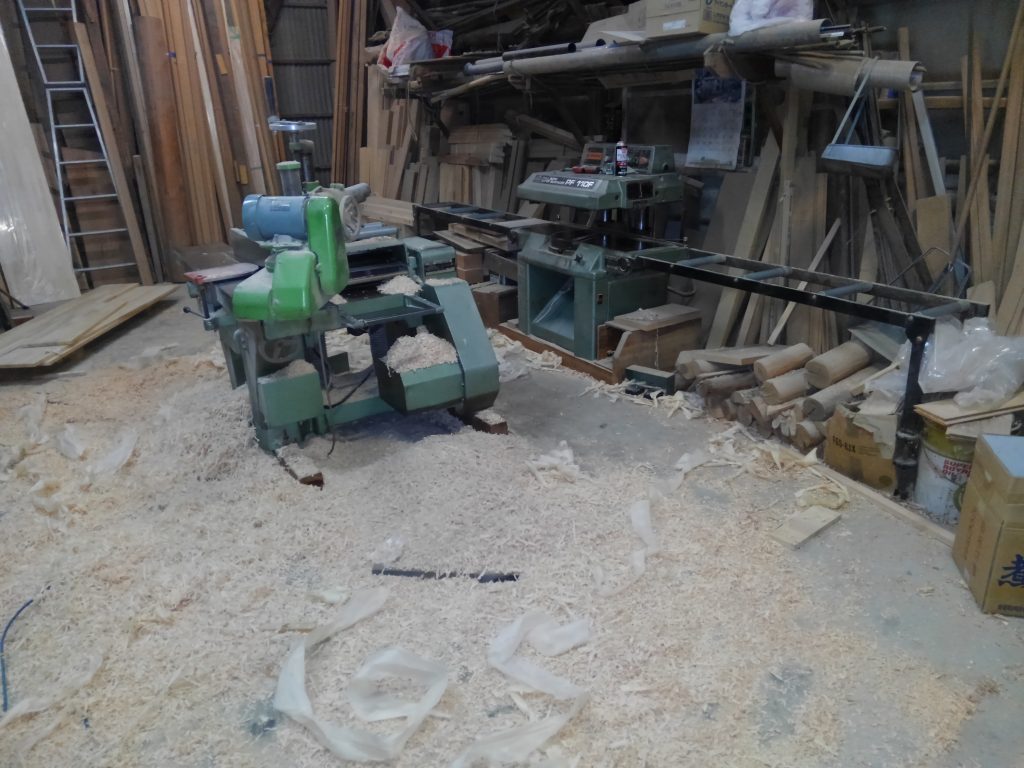 社長と大黒さんは、外部に使う木製建具の枠材づくりへと、現場での原寸図を引いたのち、作業場に戻り材料の削り作業。