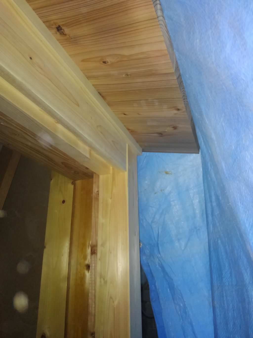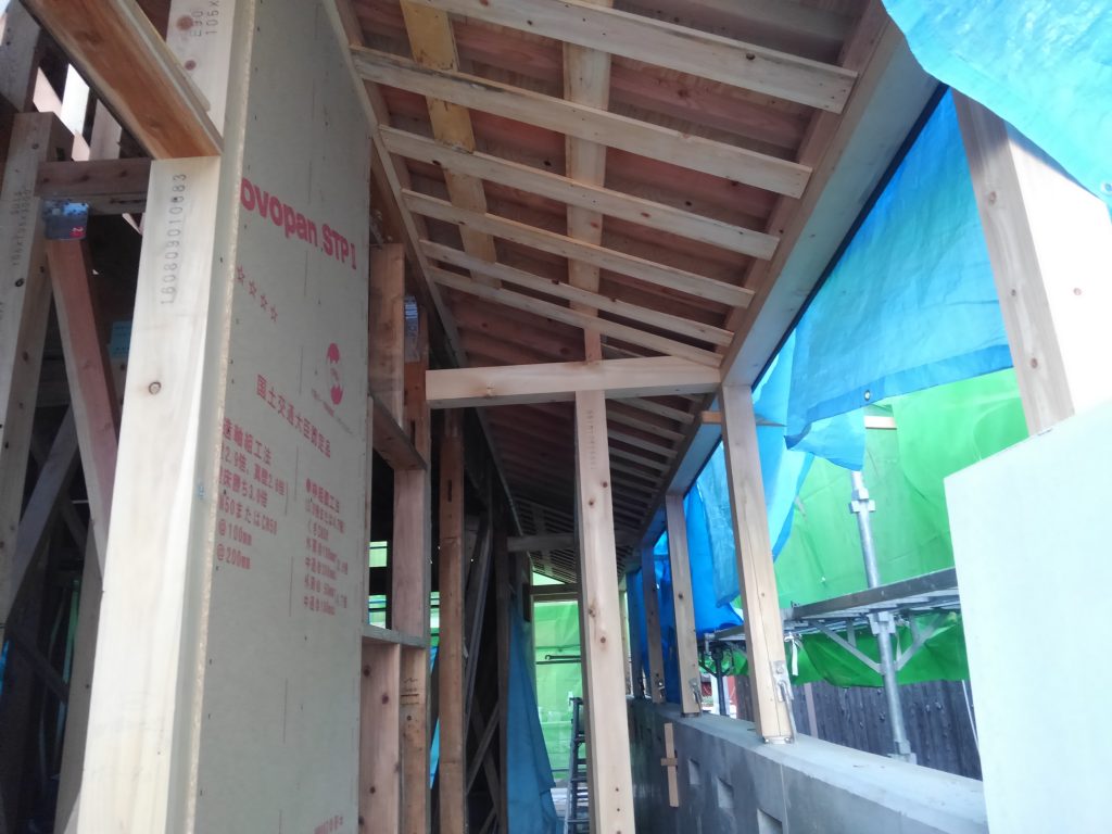 作業としては、僕は軒裏のボード張り、大黒さんはサッシの木下地の枠入れ、社長は勝手口の木製建具の内法入れ、とそれぞれが分担して作業は進行でした。