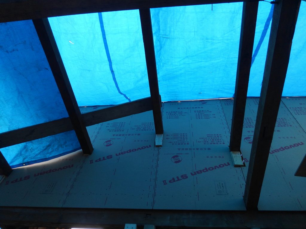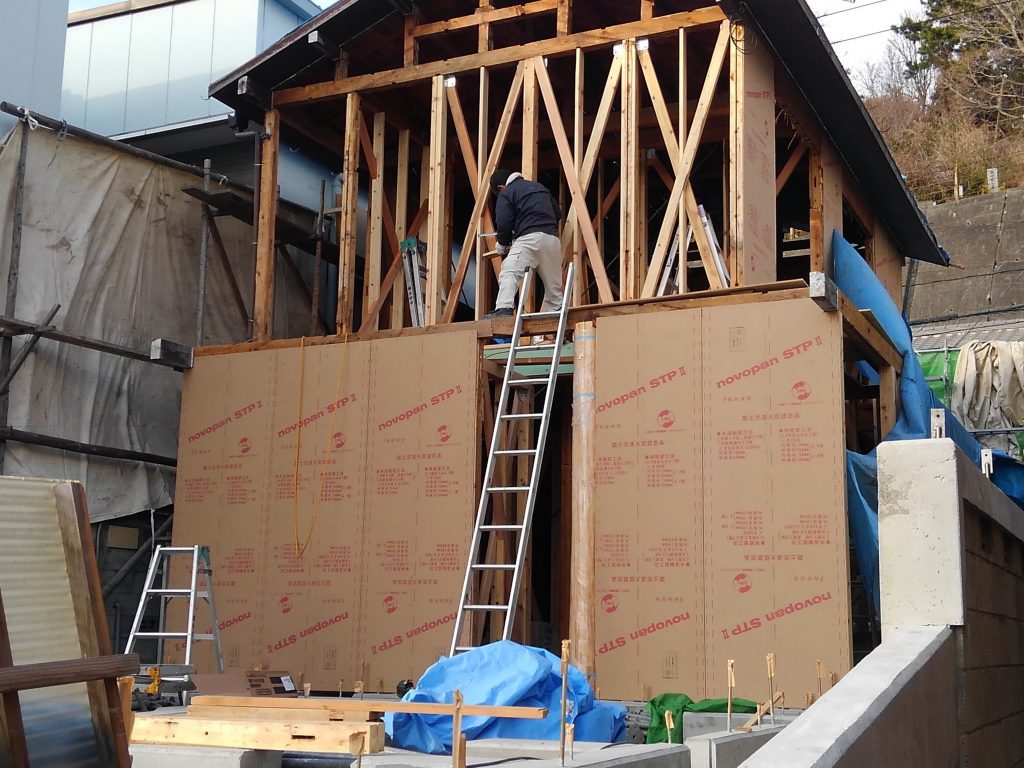 今日は朝から、バッツン・バッツンと建物の補強として、壁の面材張りからでした。