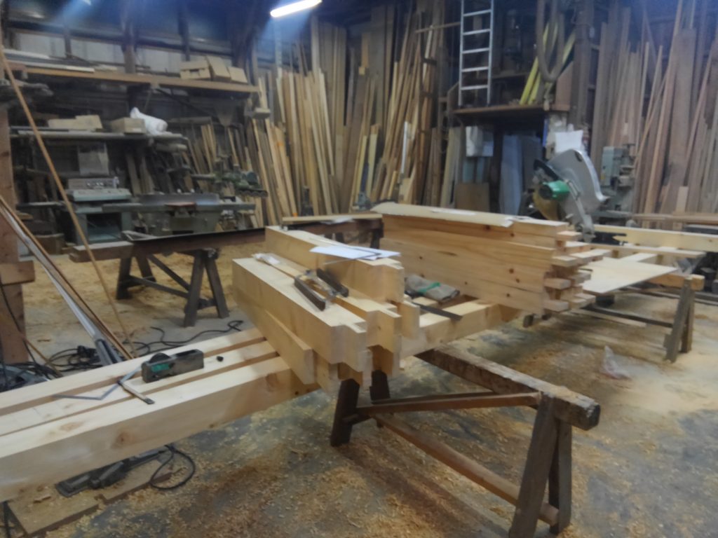 そのため、今回は、なが~~い材料を用い少しでも継ぎ手を少なくしようと、作業場を片付けながら、仕事頑張っとりました。