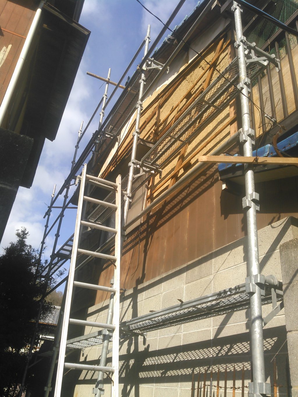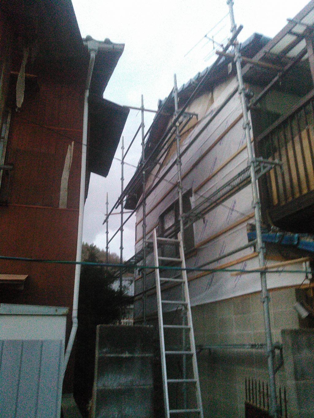 午後からは、古い外壁の撤去、防水シートの張り込み、サイディングの木下地と、順調に進行しとります。
