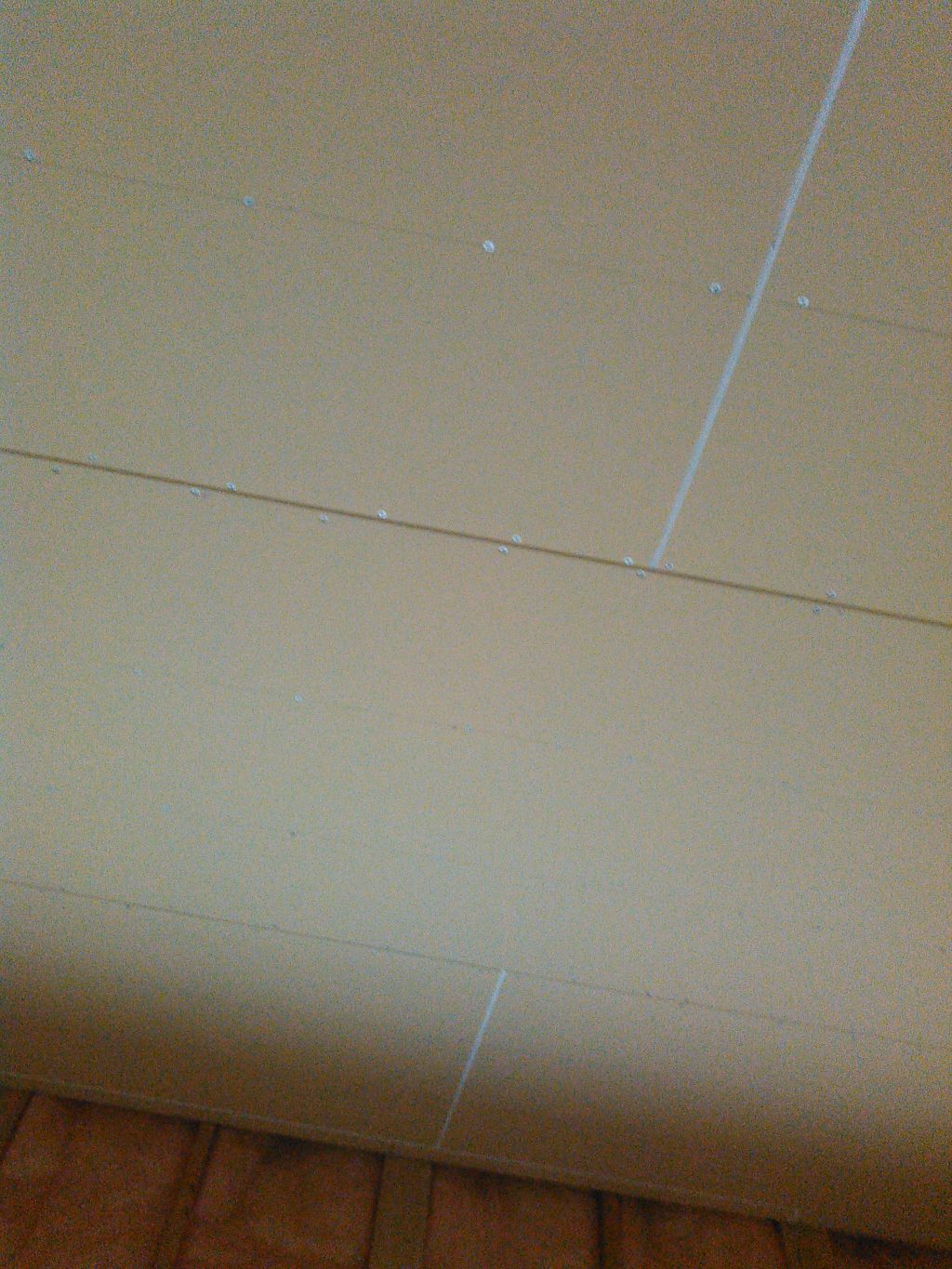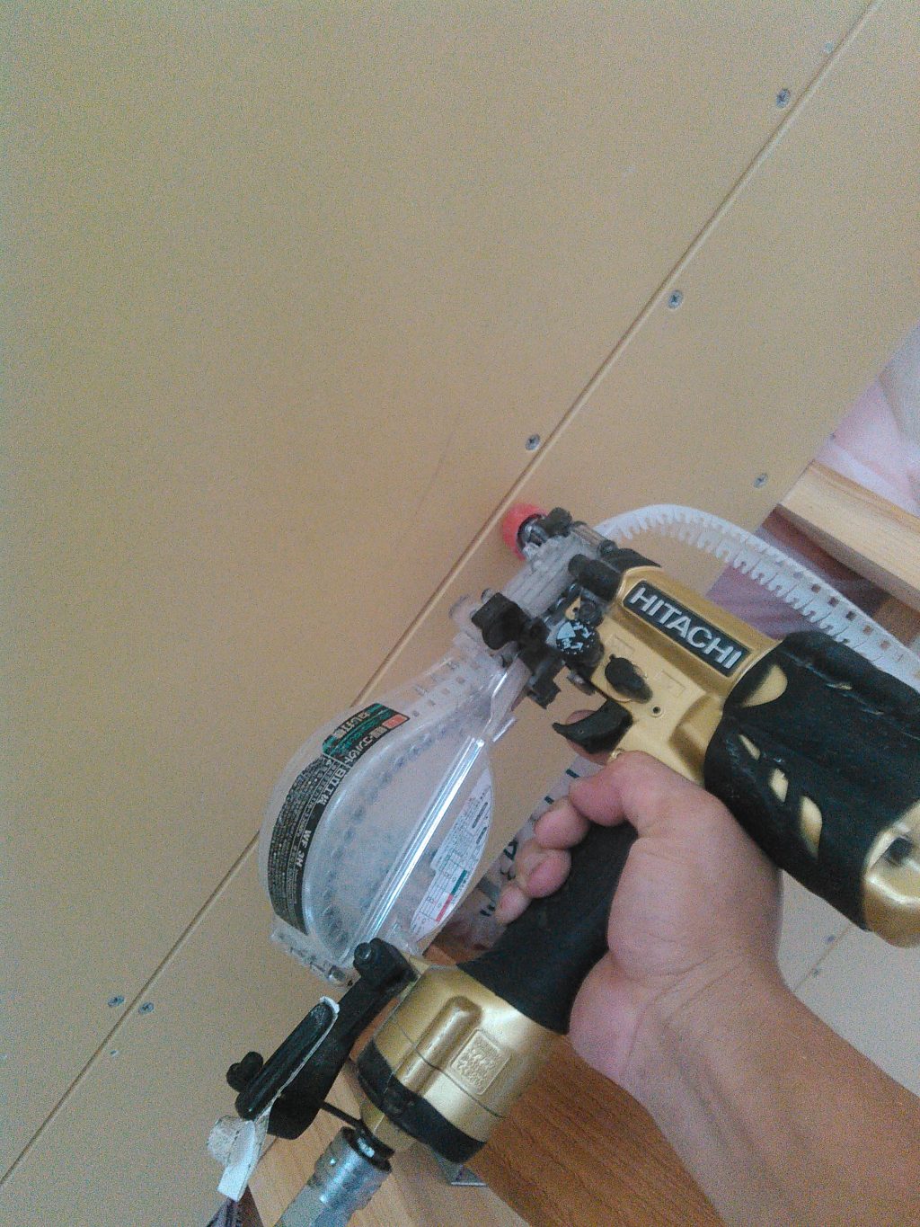 910mm×1820mmの12ミリ厚の普通の石膏ボード。なんも考えることなく、機械でプチュッ・プチュッ・・・とひたすら天井を向き、留めていく作業。