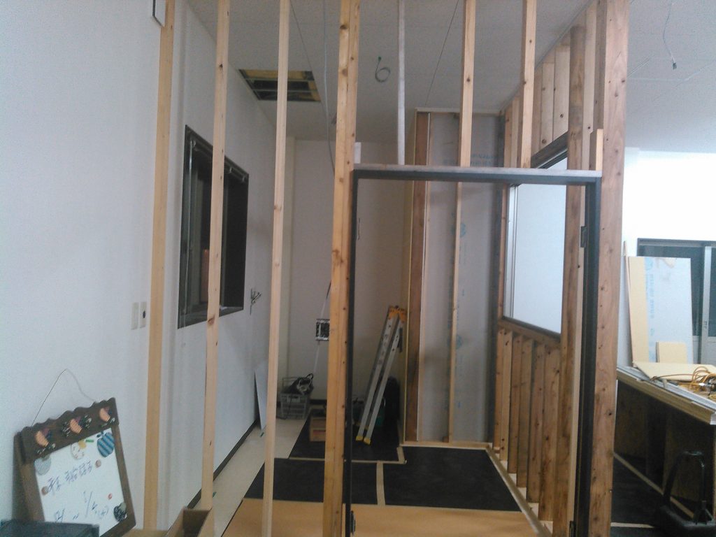 ここ数年、数回に分けて社屋の建設を請け負わせていただいているF会社様。今日は会社の中心部分となるCAD室を間仕切る部屋を作るため社長と二人、大きな作業場の中の一部をチョコット造作でした。