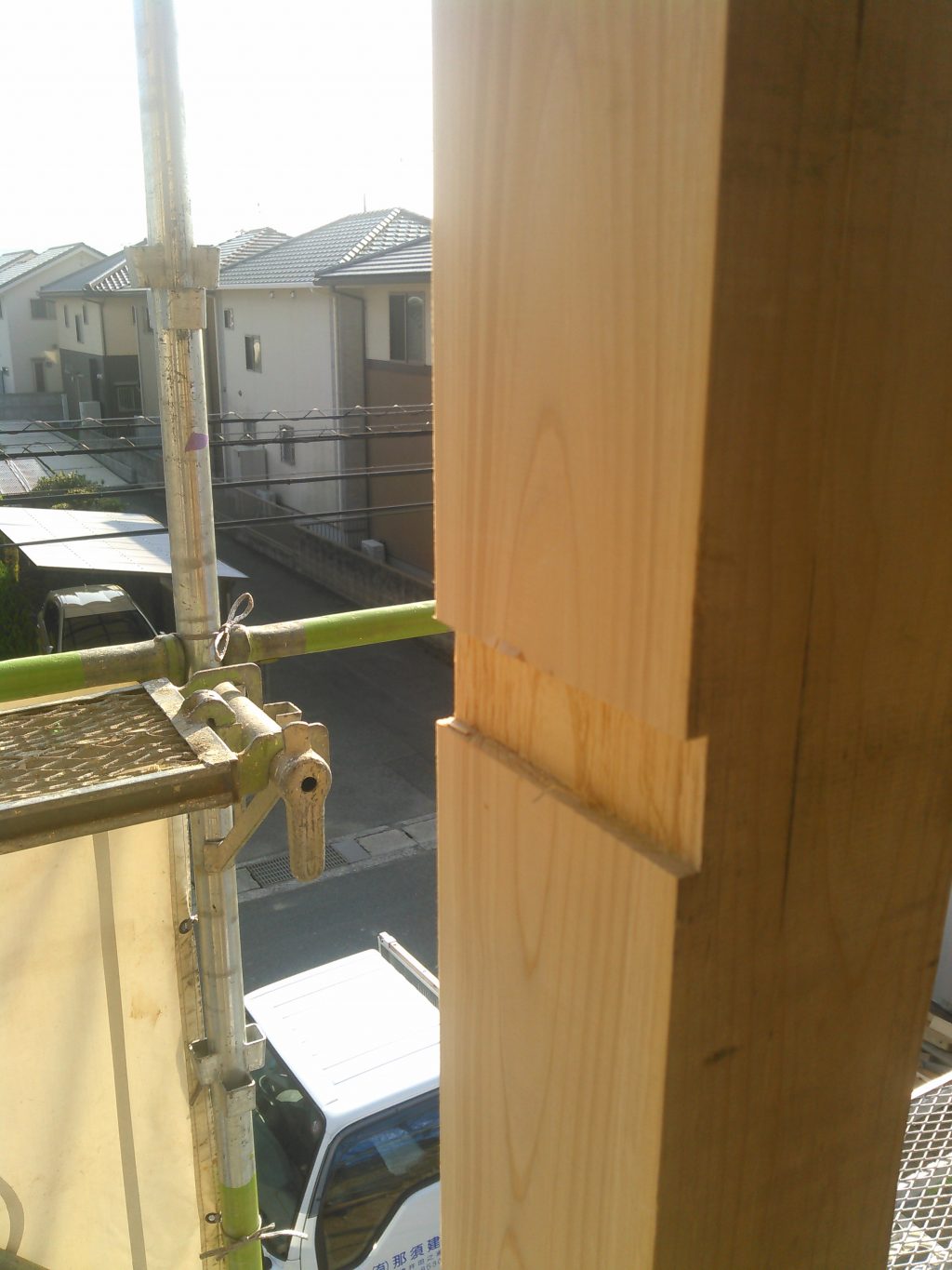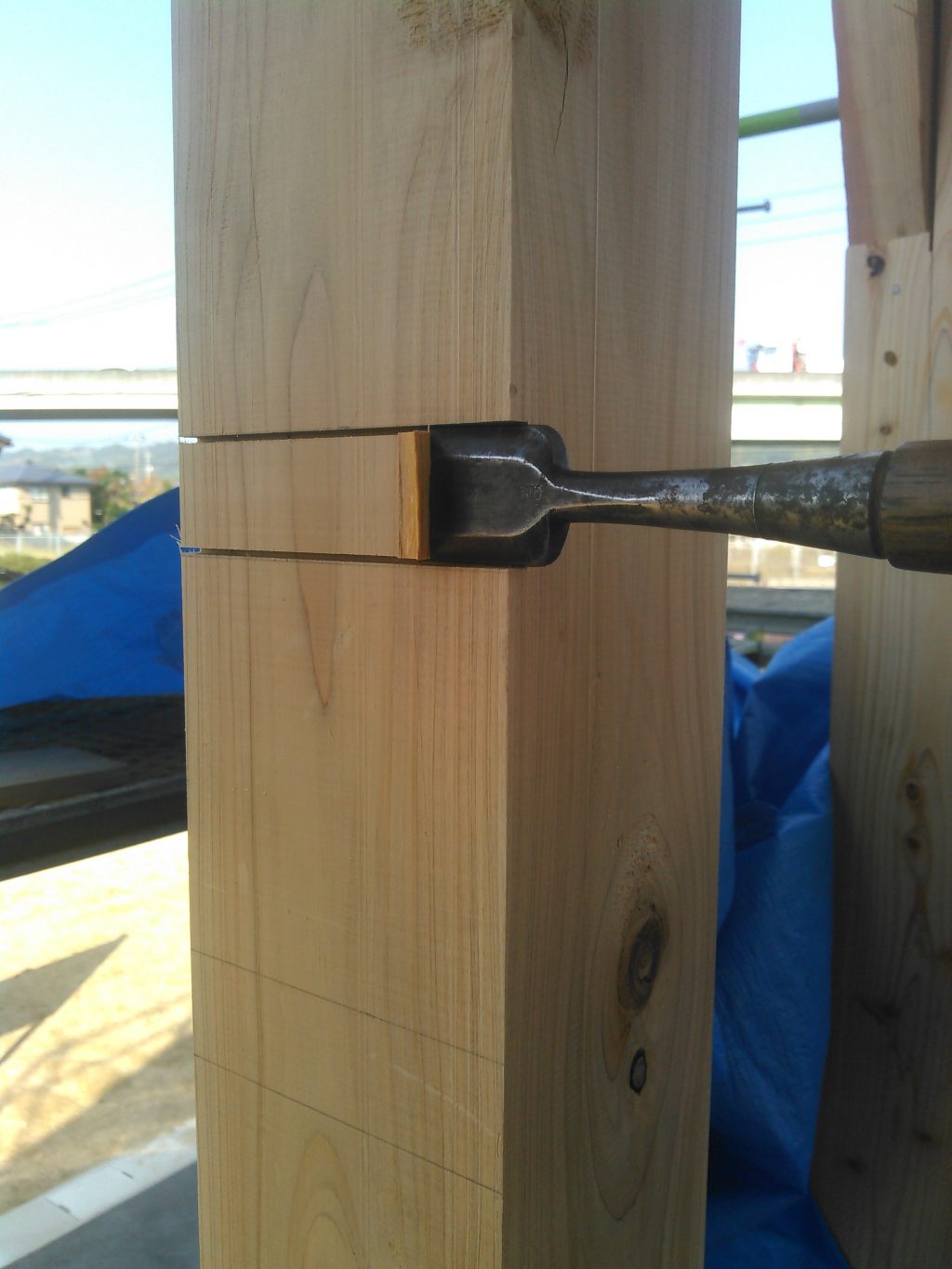 今日もサッシの下地となる木材の取り付け作業を行いました。家全体での水平を取り、柱に墨を付け、専用の定規を使い柱にシャーンと鋸を入れ、ノミでコンコン・・・とハツリ、木をポコッとはめ込む作業。