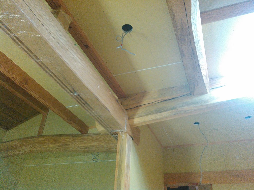 本日は午前中電気屋さんも来てくれ、埋め込み照明の穴あけ、コンセント周りの開口と仕上げ工事へ向け、準備も順調に進行中ですが、まだもう少し大工工事が終わっとらん為、急いで作業頑張っとります。