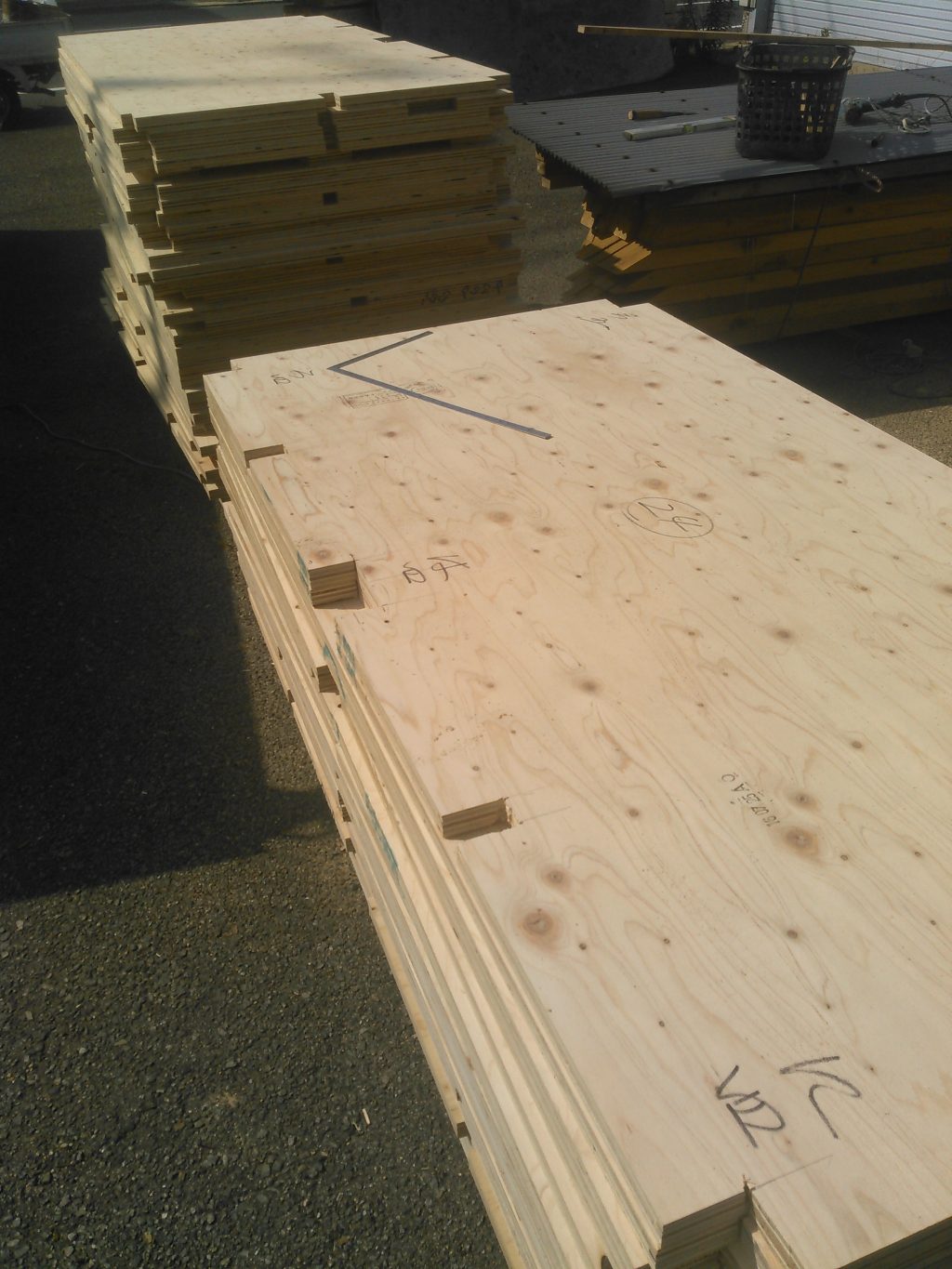 本日は、資材置き場にて来週上棟予定となっている玉島のO様邸の床に使う、合板のカットからでした。