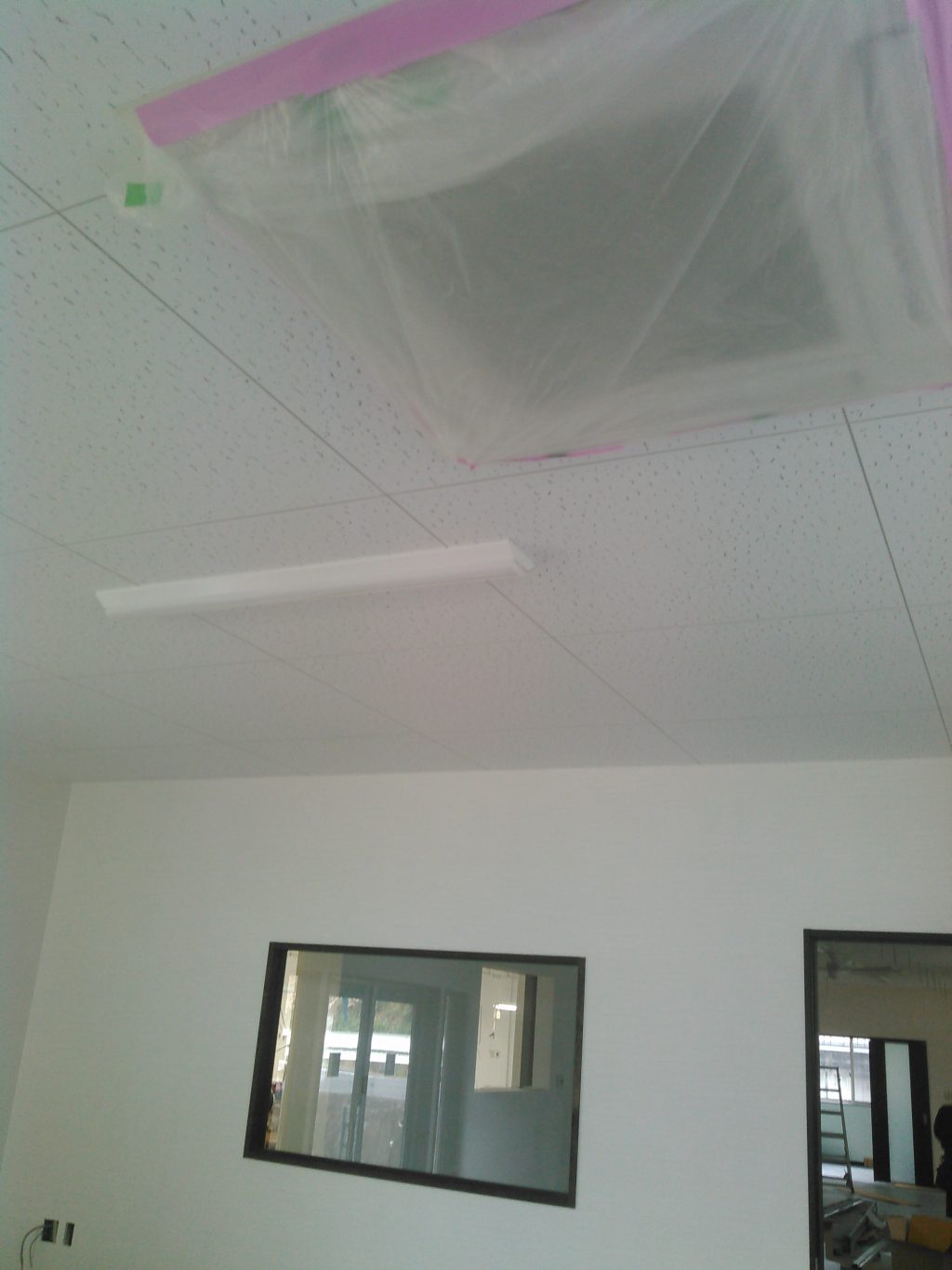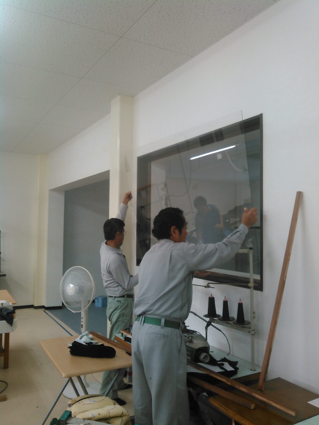 内部では、電気屋さんによる器具付けなどの仕上げ工事、ガラス屋さんの間仕切りのガラス工事と、作業は順調に進行してますが、そんな傍で、建具の取り付け、現場の掃除、邪魔にならん程度に行いました。