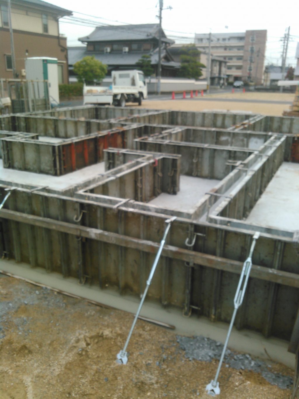 現場では、基礎の方も数日前に、コンクリートを流し込んでますが、コンクリート強度を十分に出すため、只今養生期間となっとります。