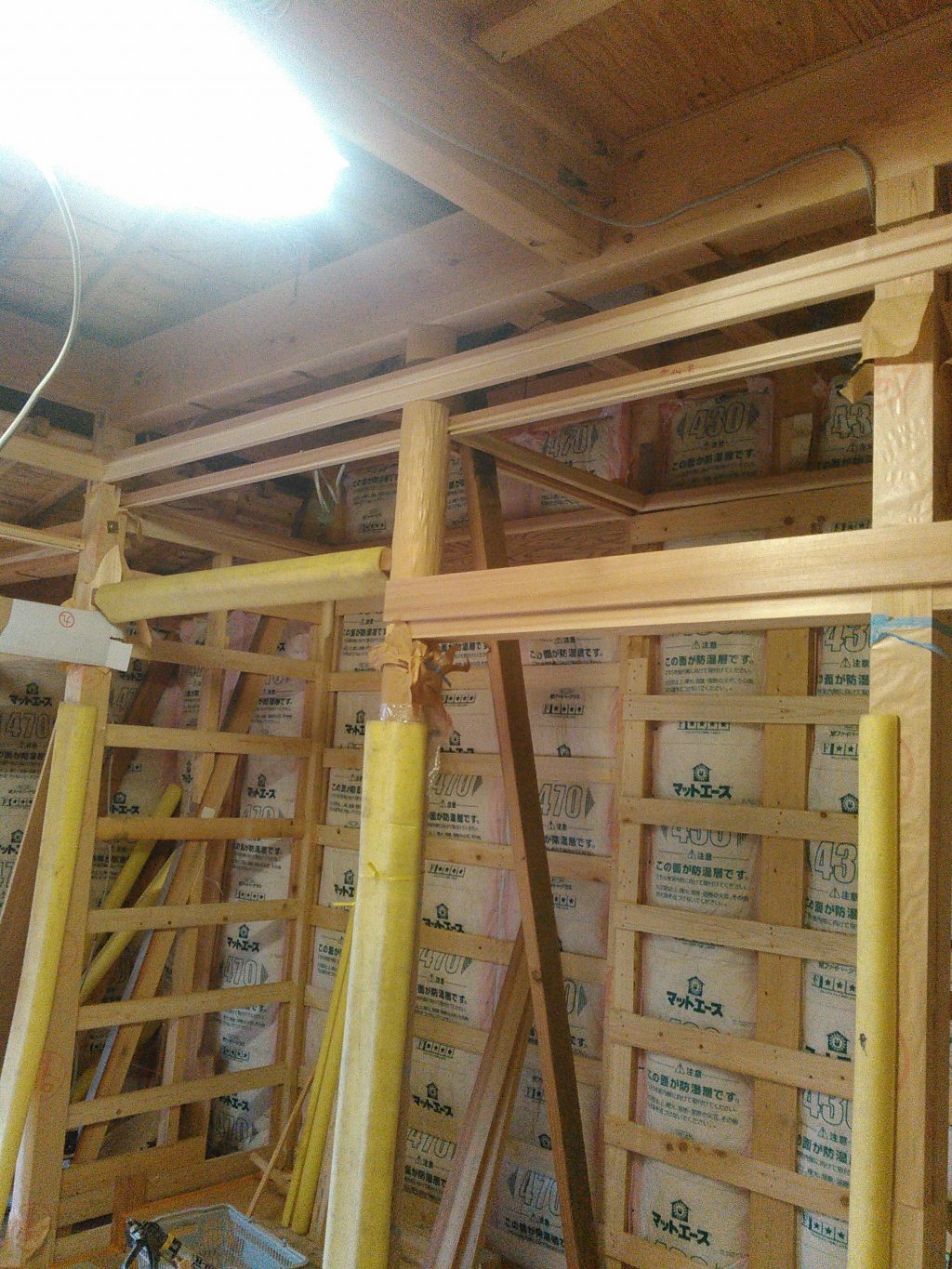 そんな作業も、二時ごろには完成で、余った時間で、加工場に戻り、床に使う断熱材のカット、柱、梁などの木材に養生を行い、本日の作業は終了です。