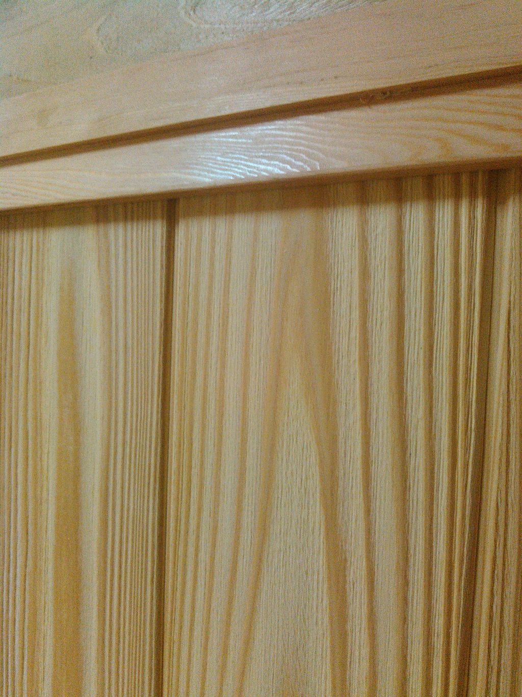 今回は「スギ」という木の腰板を使ってます。あらかじめ一枚ずつ表面を「ゴツイ歯ブラシ」みたいな機械で化粧面を荒らし、木の表面の堅い茶色い部分と、柔らかい白い部分にデコボコをつけてます。今でも和室の天井などでは、このような木目を浮かび上げる「磨り出し」を多く使いますが、今回はこの手で挑戦。