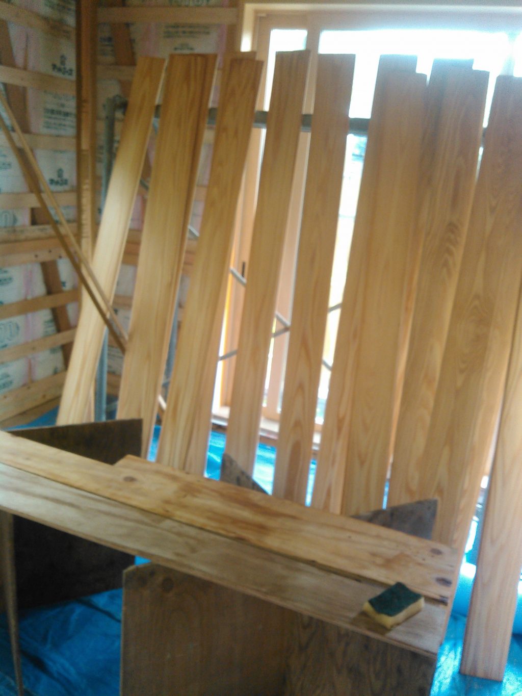 現場では、左官屋さんが外壁のモルタル塗りに来てくれていて、内部では、嫁さんが腰板に使う杉板の塗装を黙々と頑張ってくれてました。