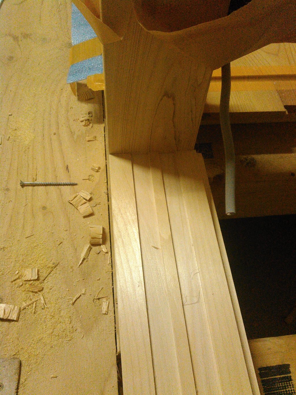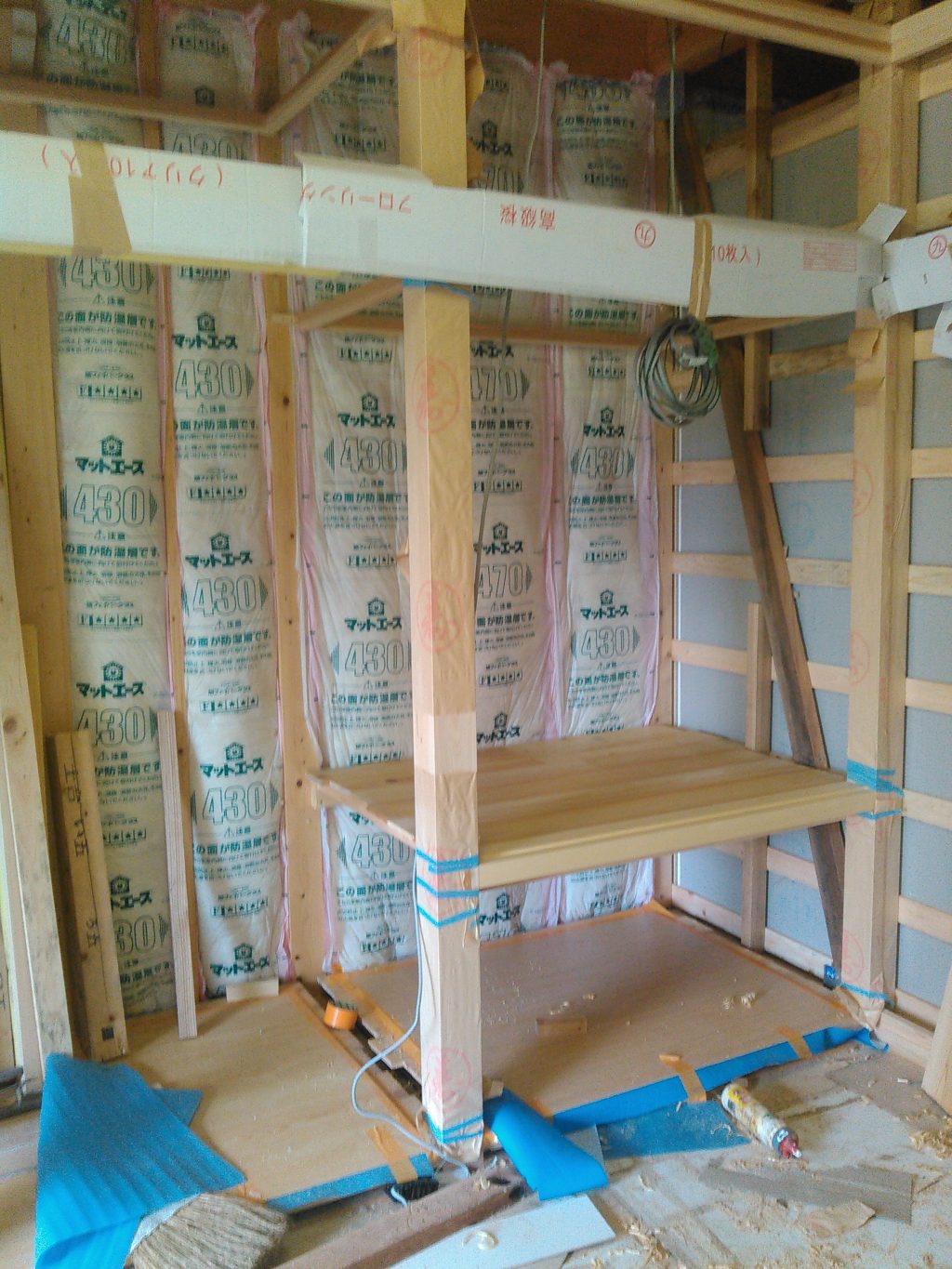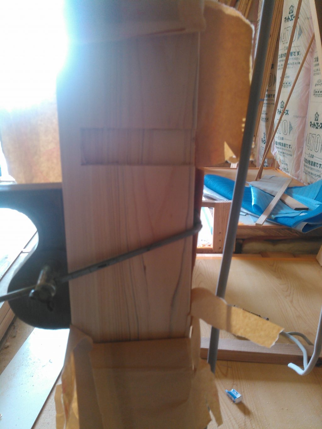 まぁ。。。そんなとこはほっといて、昨日の続きの、神様棚の造作工事の続きをせんとおえんので、柱にコリコリ穴をほり、その穴を頼りに鴨居という横木をひっつけ、その上に神様が乗るフローリングを張る仕事を進行中です。