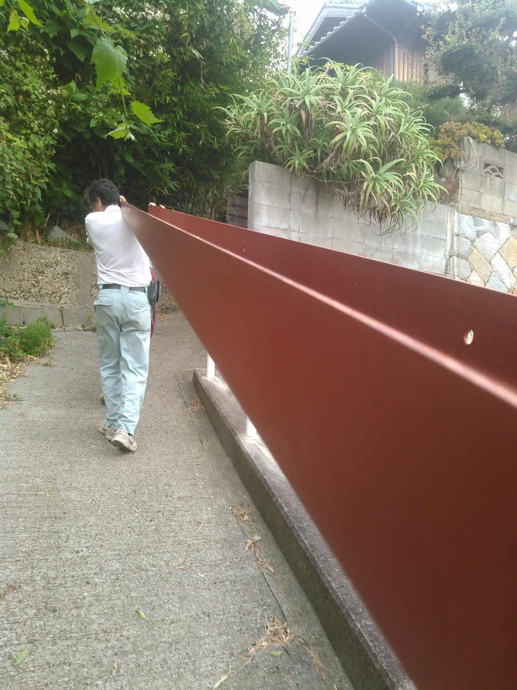 狭い山道を補強のための6mの鉄骨を、社長、ワシ、お客様にも手伝ってもらいせっせと現場へ搬入。