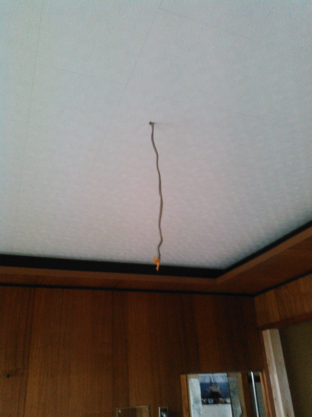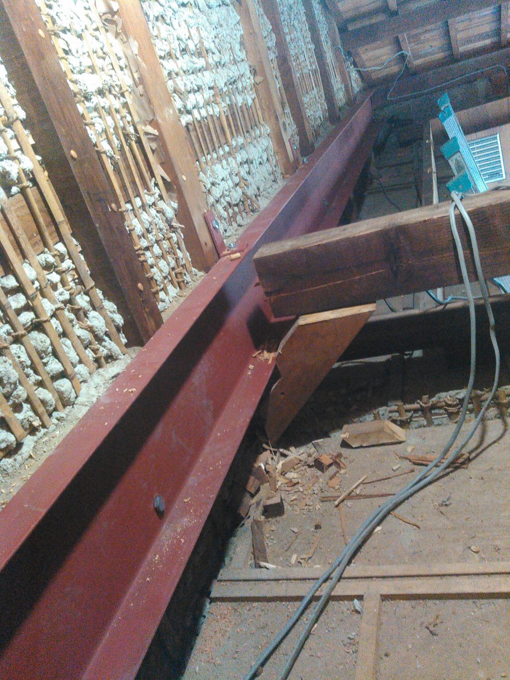 天井を破り、被害個所へと据え付け、ボルトにて固定。