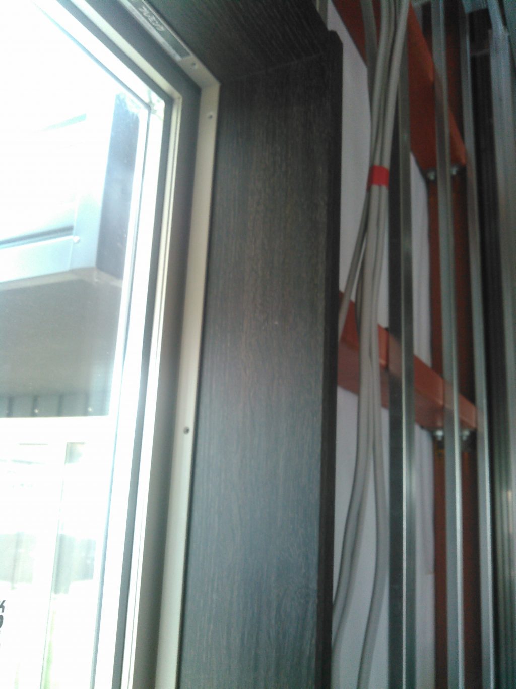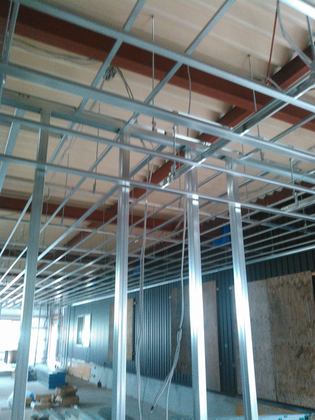 普段は「木」を扱う事に専門で工事するワシらにとっては、「ピカピカ!!!」の鉄でなんか未来の現場みたいな雰囲気で、なんか「かっこぇぇ・・・」と思いながら、お互い邪魔にならんよう、軽天屋さんの仕事を横目でチラチラ観察しながら、「キモチ悪い奴じゃのぉ。。。」と思われながら、枠材の取り付けを行ないました。