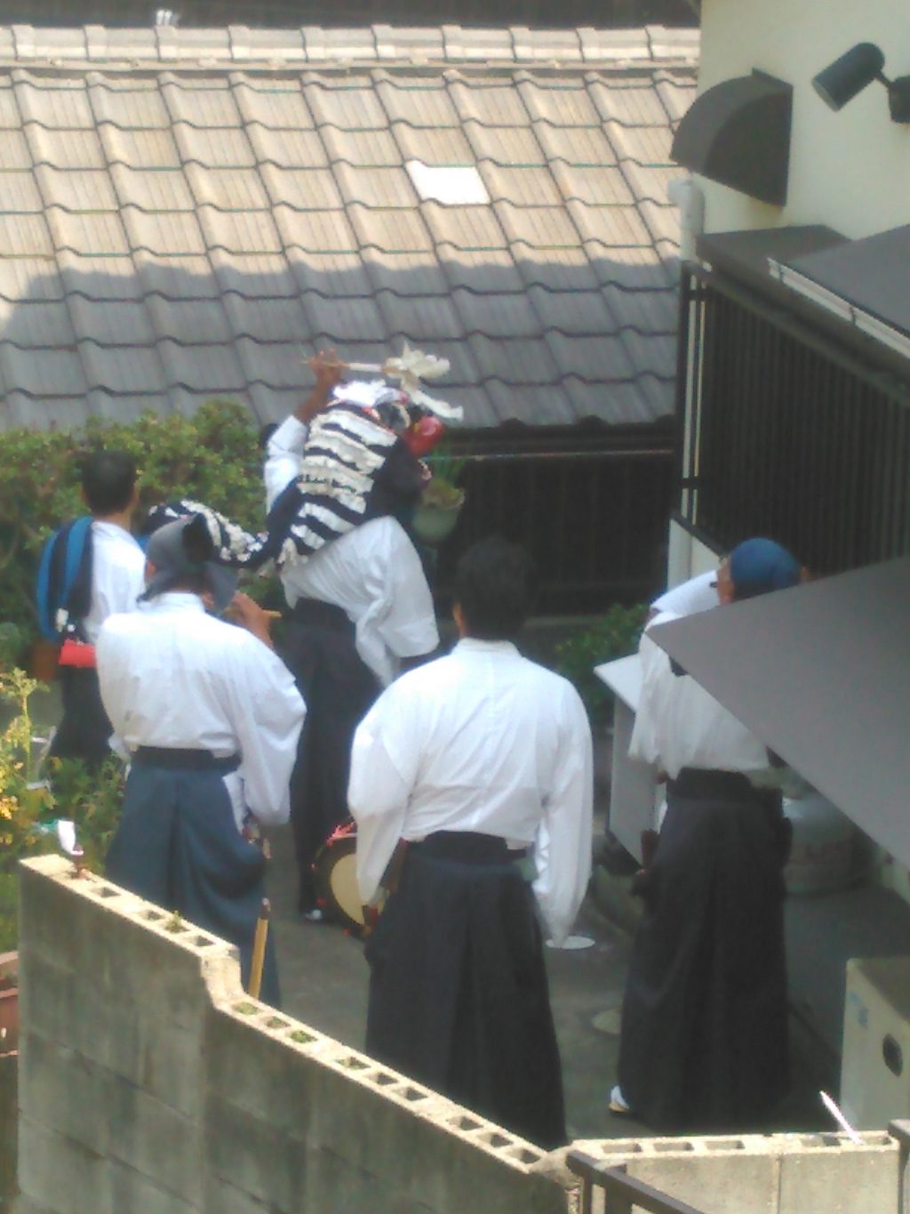 わが町下津井内では、笛、タイコなどの音と共に、夏の風物詩ともいえる、「獅子舞」がはるばる伊勢の方からやってきました。