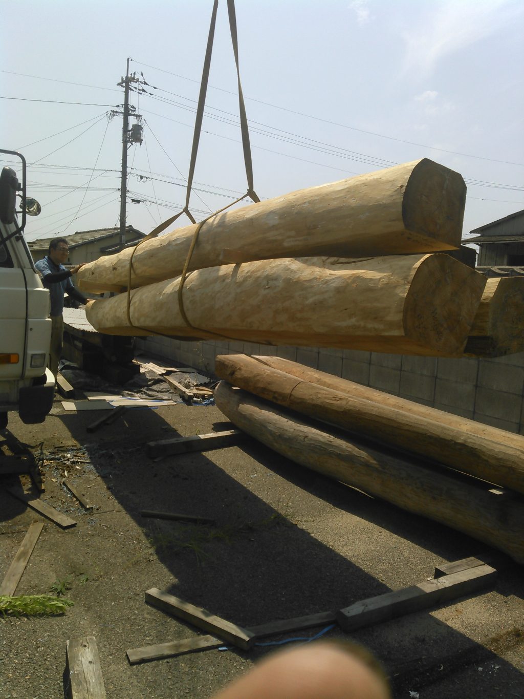 本日は、こないだ材木屋さんで買った柱や、梁の荷受け作業からでした。