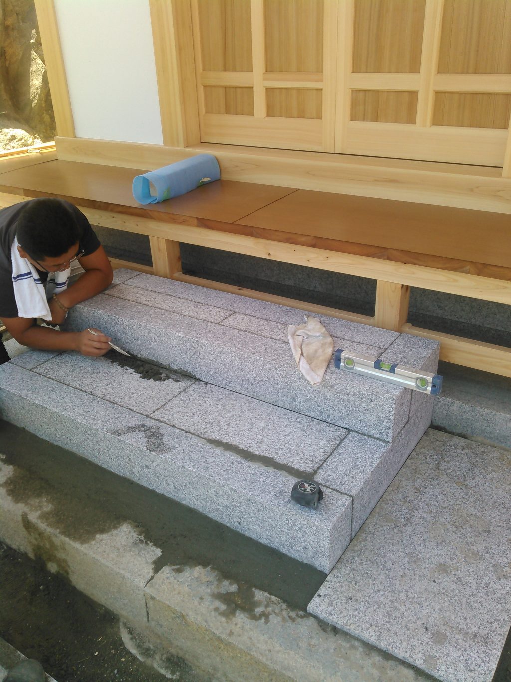 現場では、熱い中、黙々とお世話になっれいる二人組の石屋さん作業中でした。