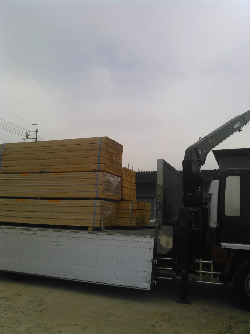 七トンユニックに山積で運んでくれた運送屋さん、これから数か月分の木材を梅雨に入る前に、どうしても入れたかった為、無理やり入れてもらった本日の搬入作業。