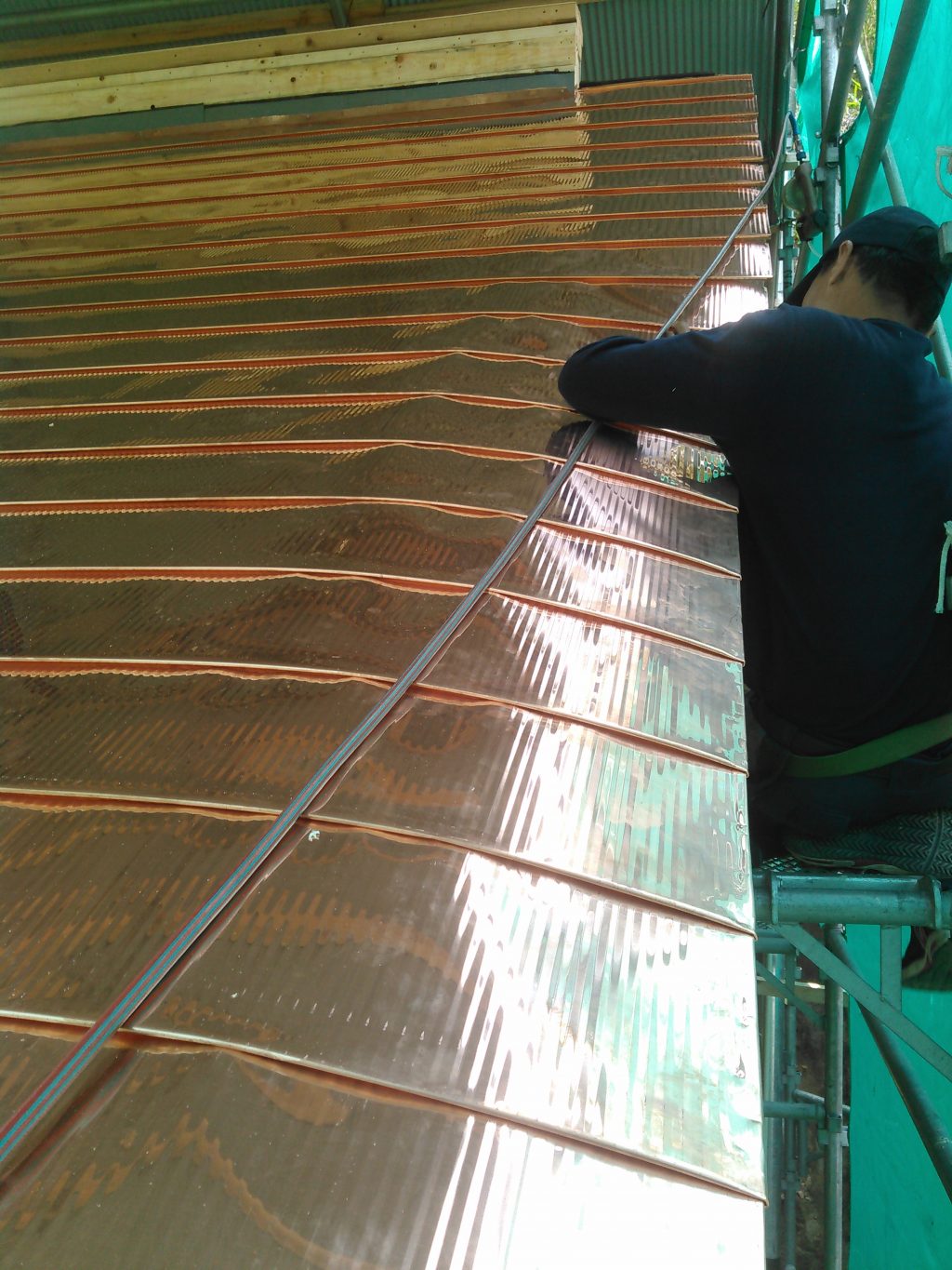 そして、見上げる屋根の上では、いつも一人でコツコツ仕上げていただく板金屋さんが、本日は助っ人を呼んでの、銅板の屋根葺き工事でした。